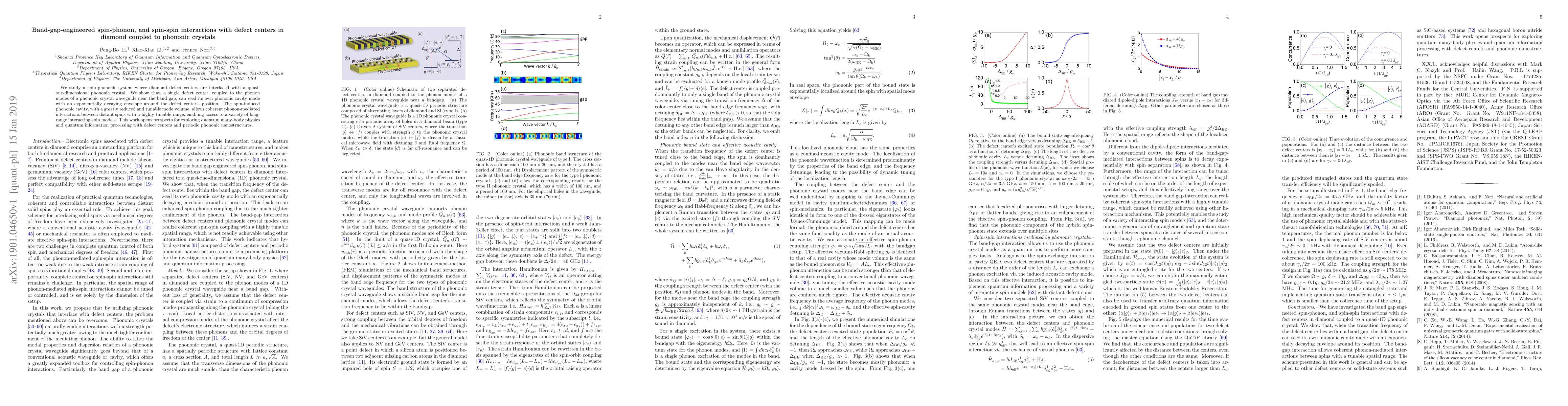 This paper investigates a spin-phononic system where diamond defect centers interact with a phononic crystal, demonstrating that a single defect center can generate a phononic cavity mode near the band gap, enabling coherent phonon-mediated interactions between distant spins over a tunable range, which has potential applications in quantum many-body physics and quantum information processing.