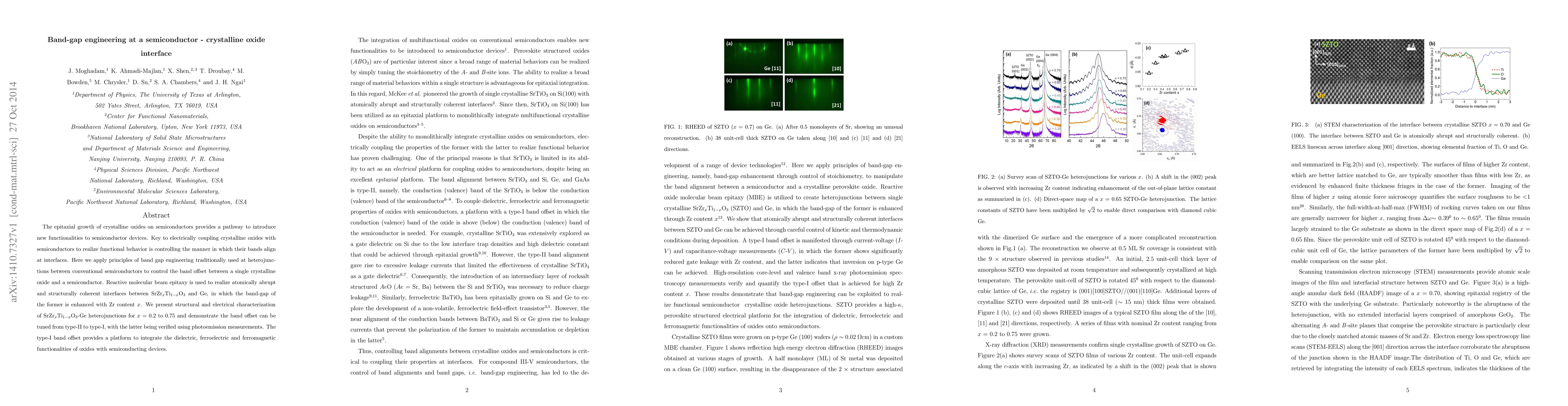 This paper explores the epitaxial growth of SrZr$_{x}$Ti$_{1-x}$O$_3$ on Ge via reactive molecular beam epitaxy, demonstrating the tunability of band offsets from type-II to type-I through varying Zr content. This band-gap engineering enables the integration of diverse functionalities from crystalline oxides into semiconductor devices.