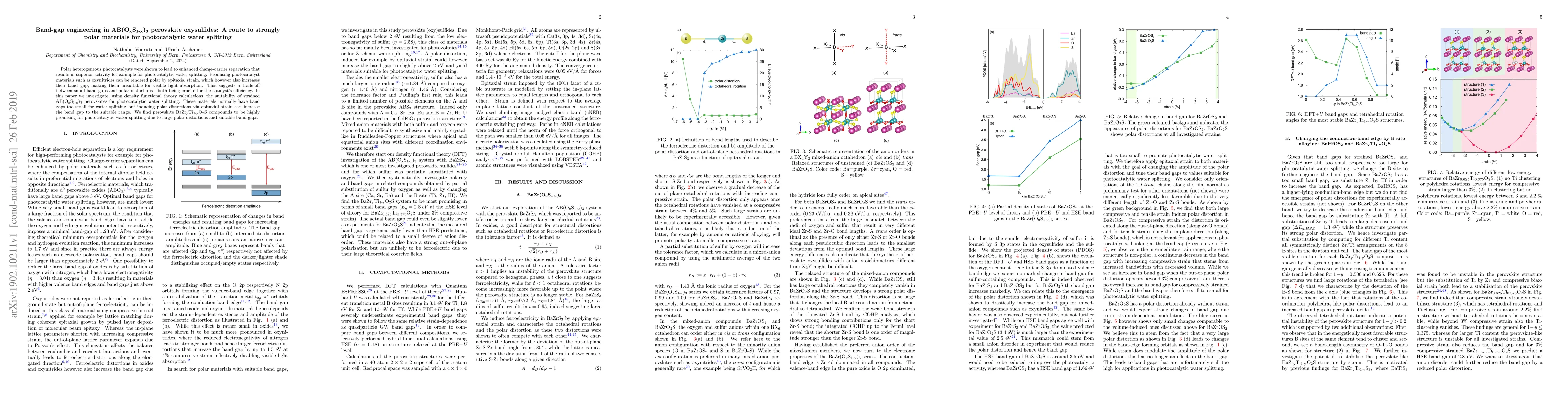 Polar heterogeneous photocatalysts were shown to lead to enhanced charge-carrier separation that results in superior activity for example for photocatalytic water splitting. Promising photocatalyst materials such as oxynitrides can be rendered polar by epitaxial strain, which however also increases their band gap, making them unsuitable for visible light absorption. This suggests a trade-off between small band gaps and polar distortions - both being crucial for the catalyst's efficiency. In this paper we investigate, using density functional theory calculations, the suitability of strained AB(O$_x$S$_{1-x}$)$_{3}$ perovskites for photocatalytic water splitting. These materials normally have band gaps too small for water splitting but inducing polar distortions via epitaxial strain can increase the band gap to the suitable range. We find perovskite BaZr$_y$Ti$_{1-y}$O$_2$S compounds to be highly promising for photocatalytic water splitting due to large polar distortions and suitable band gaps.