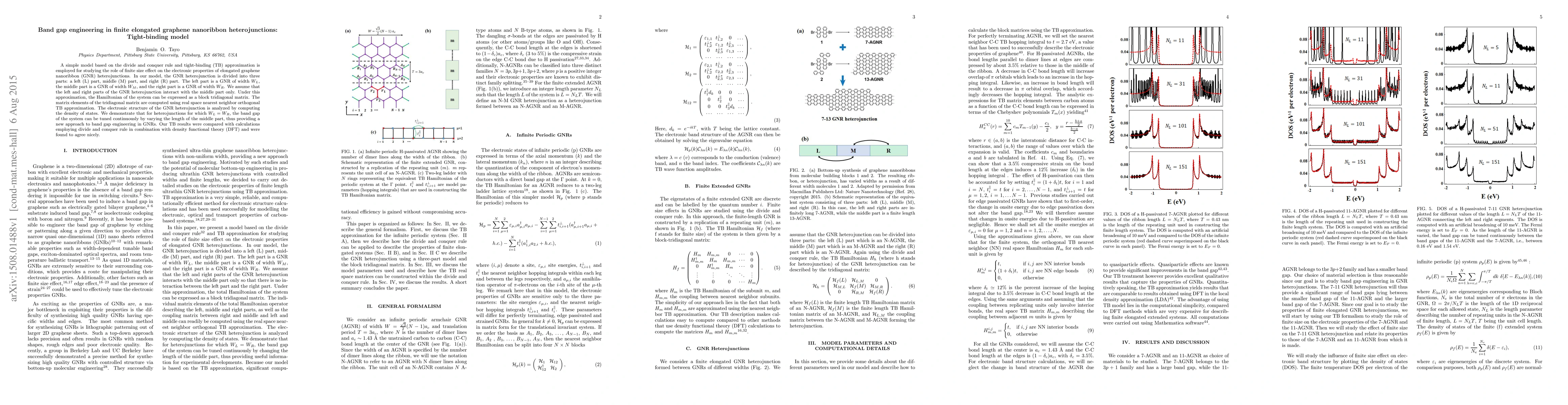 A simple model based on the divide and conquer rule and tight-binding (TB) approximation is employed for studying the role of finite size effect on the electronic properties of elongated graphene nanoribbon (GNR) heterojunctions. In our model, the GNR heterojunction is divided into three parts: a left (L) part, middle (M) part, and right (R) part. The left part is a GNR of width $W_{L}$, the middle part is a GNR of width $W_{M}$, and the right part is a GNR of width $W_{R}$. We assume that the left and right parts of the GNR heterojunction interact with the middle part only. Under this approximation, the Hamiltonian of the system can be expressed as a block tridiagonal matrix. The matrix elements of the tridiagonal matrix are computed using real space nearest neighbor orthogonal TB approximation. The electronic structure of the GNR heterojunction is analyzed by computing the density of states. We demonstrate that for heterojunctions for which $W_{L} = W_{R}$, the band gap of the system can be tuned continuously by varying the length of the middle part, thus providing a new approach to band gap engineering in GNRs. Our TB results were compared with calculations employing divide and conquer rule in combination with density functional theory (DFT) and were found to agree nicely.