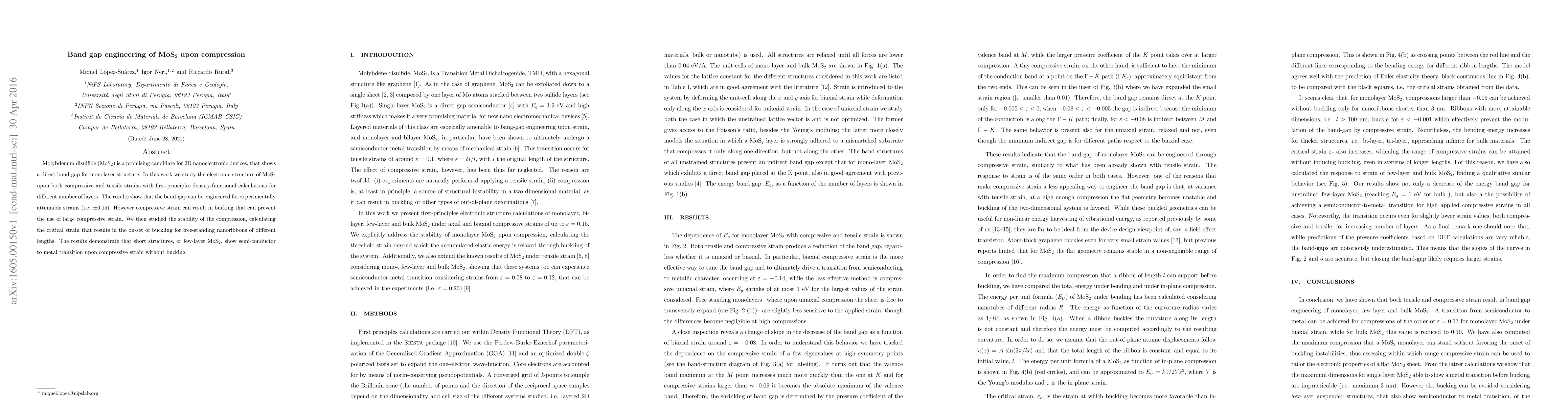Molybdenum disulfide (MoS$_2$) is a promising candidate for 2D nanoelectronic devices, that shows a direct band-gap for monolayer structure. In this work we study the electronic structure of MoS$_2$ upon both compressive and tensile strains with first-principles density-functional calculations for different number of layers. The results show that the band-gap can be engineered for experimentally attainable strains (i.e. $\pm 0.15$). However compressive strain can result in bucking that can prevent the use of large compressive strain. We then studied the stability of the compression, calculating the critical strain that results in the on-set of buckling for free-standing nanoribbons of different lengths. The results demonstrate that short structures, or few-layer MoS$_2$, show semi-conductor to metal transition upon compressive strain without bucking.