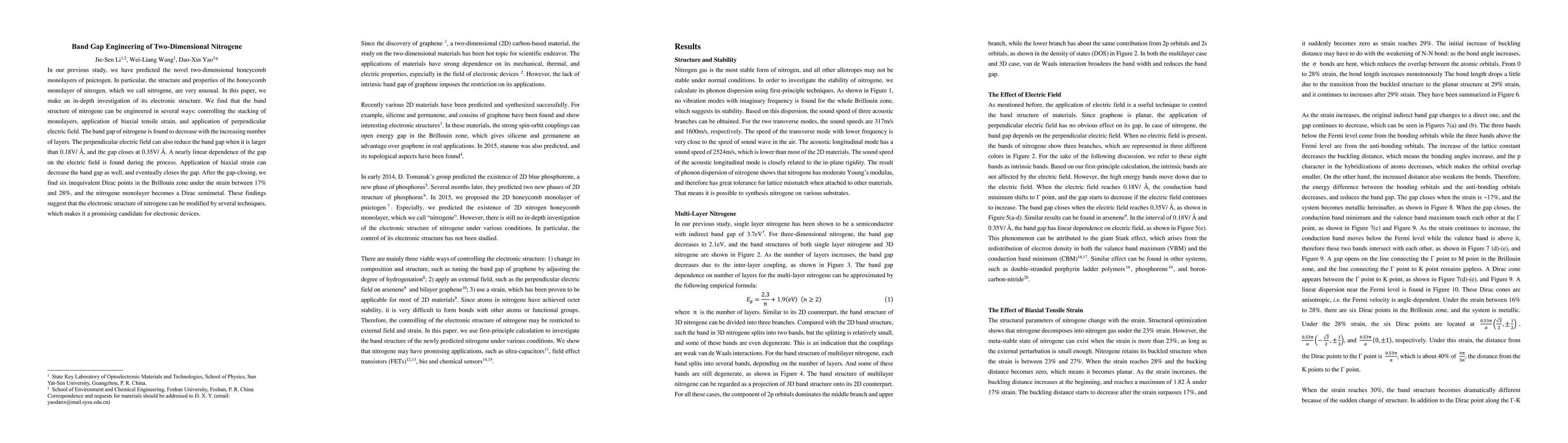 In our previous study, we have predicted the novel two-dimensional honeycomb monolayers of pnictogen. In particular, the structure and properties of the honeycomb monolayer of nitrogen, which we call nitrogene, are very unusual. In this paper, we make an in-depth investigation of its electronic structure. We find that the band structure of nitrogene can be engineered in several ways: controlling the stacking of monolayers, application of biaxial tensile strain, and application of perpendicular electric field. The band gap of nitrogene is found to decrease with the increasing number of layers. The perpendicular electric field can also reduce the band gap when it is larger than 0.18V/ {\AA}, and the gap closes at 0.35V/ {\AA}. A nearly linear dependence of the gap on the electric field is found during the process. Application of biaxial strain can decrease the band gap as well, and eventually closes the gap. After the gap-closing, we find six inequivalent Dirac points in the Brillouin zone under the strain between 17% and 28%, and the nitrogene monolayer becomes a Dirac semimetal. These findings suggest that the electronic structure of nitrogene can be modified by several techniques, which makes it a promising candidate for electronic devices.