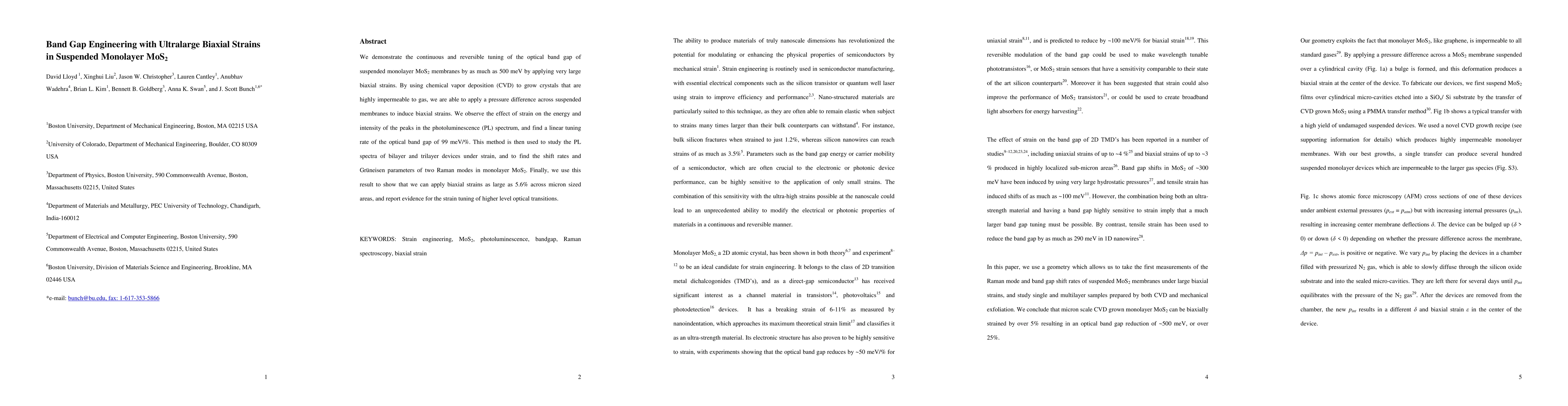 This study shows how applying ultralarge biaxial strains via pressure difference to suspended monolayer MoS2 using CVD techniques can continuously and reversibly tune the optical band gap by up to 500 meV, with a linear tuning rate of 99 meV/%. The method also reveals strain effects on photoluminescence and Raman modes, demonstrating strain-induced shifts and higher-level optical transition tuning.