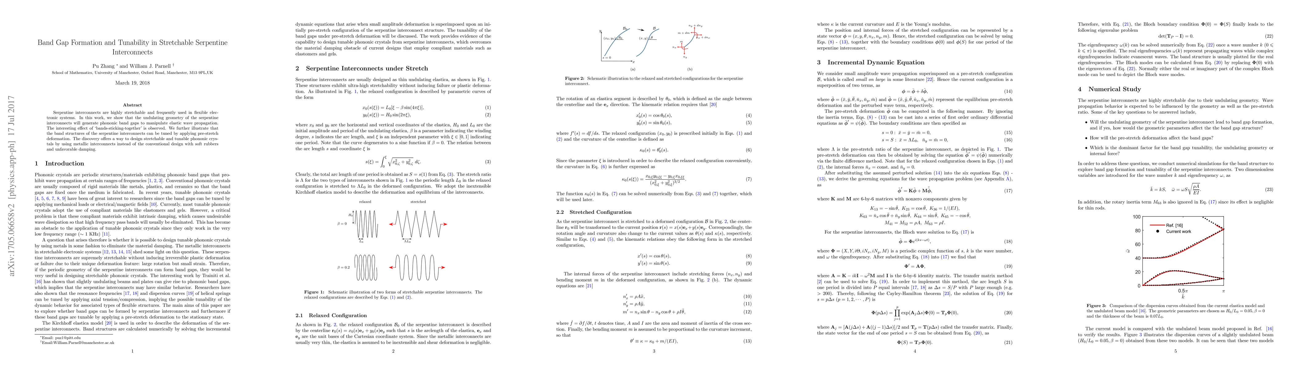 This paper demonstrates that serpentine interconnects create phononic band gaps to control elastic wave propagation, with a notable "bands-sticking-together" effect. The study also shows that pre-stretch deformation can tune these band structures, offering a new method for designing stretchable and tunable phononic crystals using metallic interconnects.