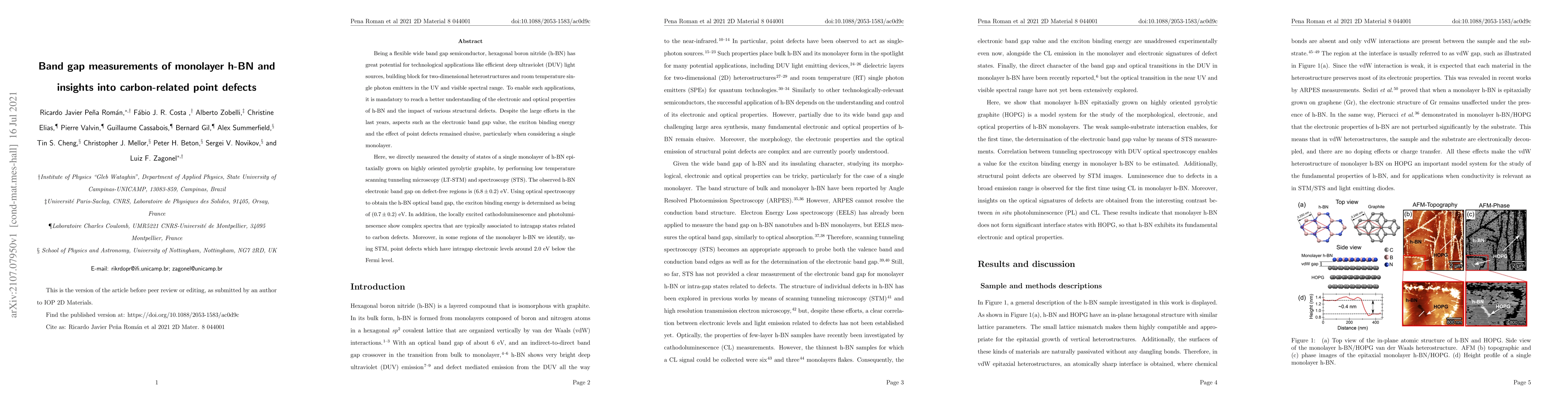 This study directly measures the electronic and optical band gaps of monolayer hexagonal boron nitride (h-BN) using scanning tunneling microscopy and spectroscopy, finding a value of $(6.8\pm0.2)$ eV for the electronic band gap and $(0.7\pm0.2)$ eV for the exciton binding energy. It also identifies carbon-related point defects impacting intragap states.