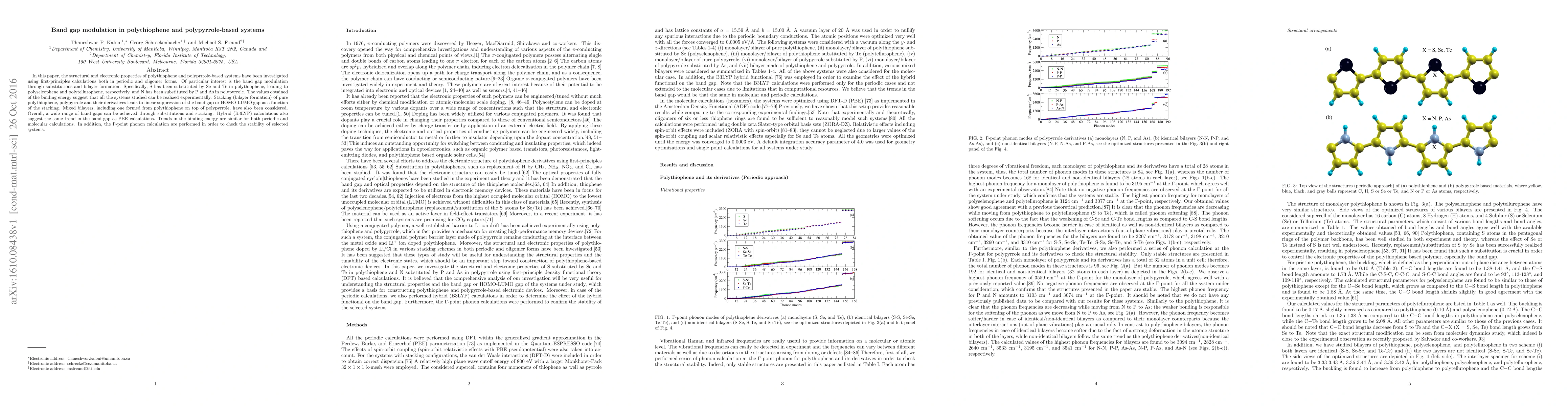 This paper investigates band gap modulation in polythiophene and polypyrrole systems via first-principles calculations, focusing on substitutions (S by Se/Te in polythiophene, N by P/As in polypyrrole) and bilayer formations. Results show a wide range of achievable band gaps through these modifications.