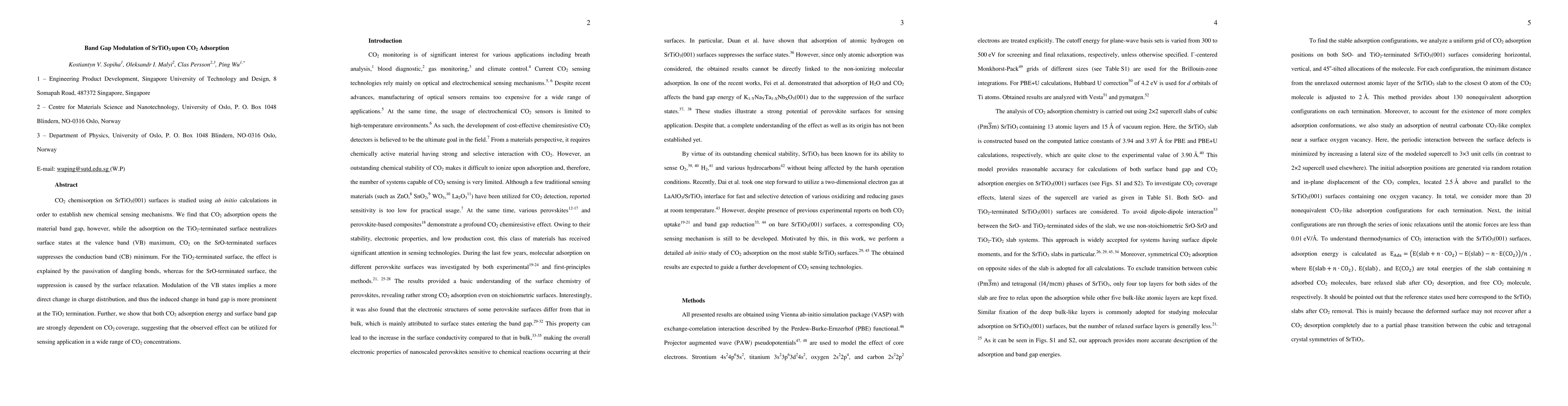 This study reveals that CO2 adsorption on SrTiO3 surfaces modulates the material's band gap, with different effects on TiO2 and SrO terminations, and suggests potential for CO2 sensing applications based on these changes.