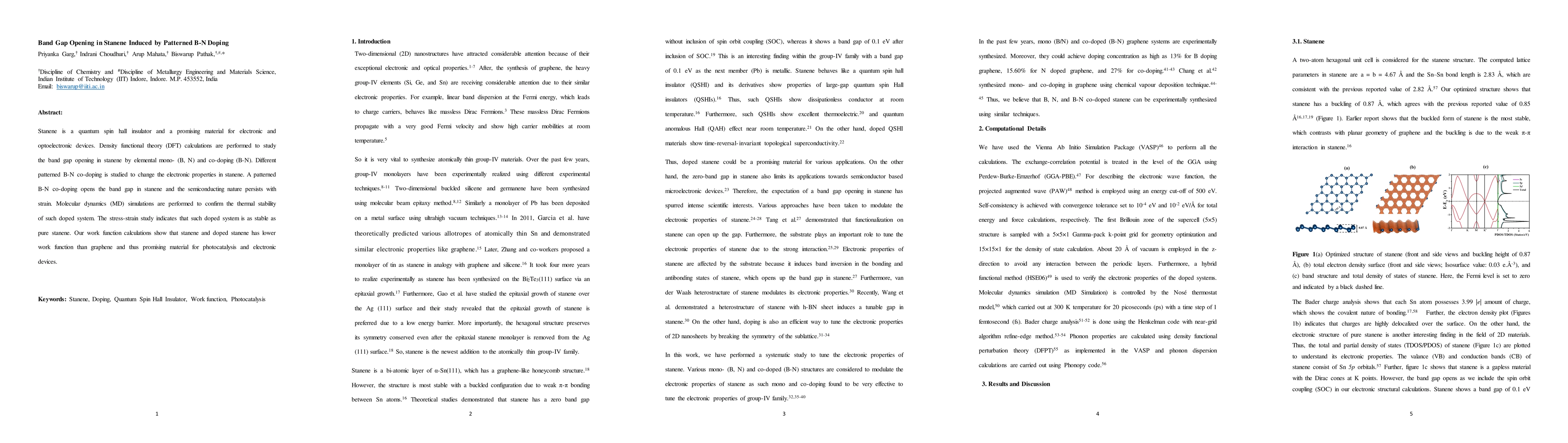 This paper investigates the band gap opening in stanene through B-N doping using DFT calculations and MD simulations. Patterned B-N co-doping successfully induces semiconducting properties that remain stable under strain, making it a promising material for electronic and optoelectronic applications.