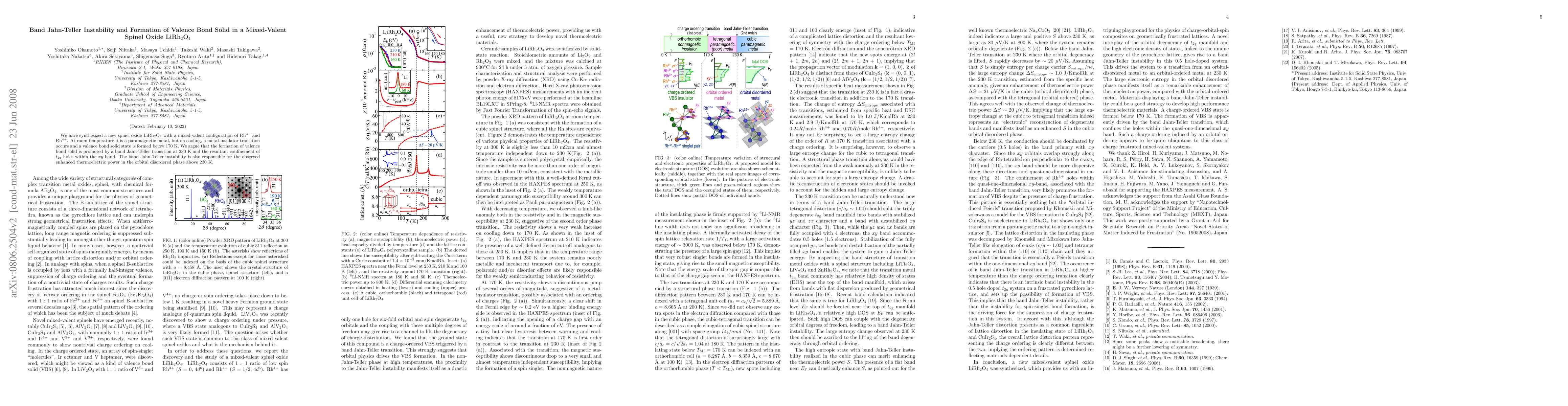 This paper reports the synthesis of LiRh2O4, a mixed-valent spinel oxide exhibiting a metal-insulator transition below 170 K. The transition is attributed to a band Jahn-Teller instability at 230 K, leading to the formation of a valence bond solid and enhanced thermoelectric properties.