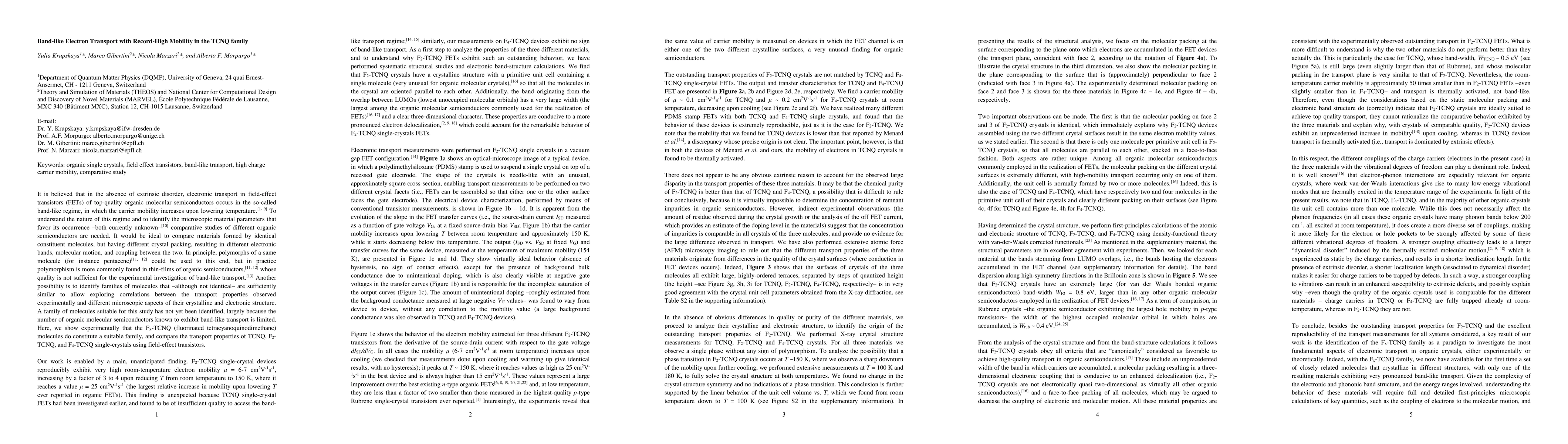 In highest quality organic single-crystal field-effect transistors, electron transport occurs in the band-like regime, with the carrier mobility increasing upon lowering temperature. Neither the microscopic nature of this regime, nor why it occurs only in a small number of materials is currently understood. Here, comparative studies of closely related materials, exhibiting high-quality reproducible transport properties are needed. We performed a study of electron transport in single-crystals of different TCNQ (tetracyanoquinodimethane) molecules, combined with band structure calculations. We show that F2-TCNQ devices exhibit very high electron mobility and an unprecedented increase in mobility upon cooling, whereas in TCNQ and F4-TCNQ the mobility is substantially lower and decreases upon cooling. We analyze the crystal and electronic structures of these materials and find that F2-TCNQ crystals are indeed ideal to achieve outstanding transport properties. Our analysis also shows that to understand the difference between the three materials, studying their band structure is not sufficient, and that the electron-phonon coupling needs to be investigated as well. Besides the outstanding transport properties of F2-TCNQ, a key result of our work is the identification of the Fx-TCNQ family as a paradigm to investigate the most fundamental aspects of electronic transport in organic crystals.