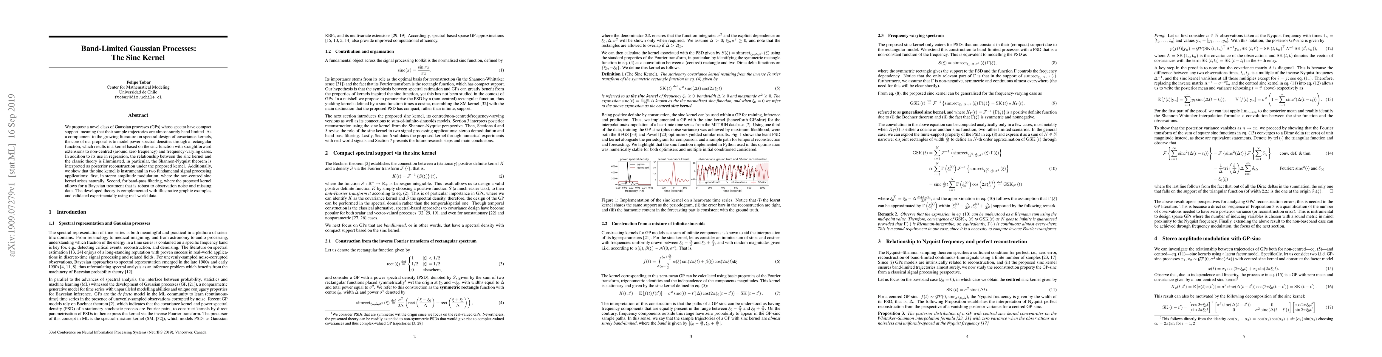 We propose a novel class of Gaussian processes (GPs) whose spectra have compact support, meaning that their sample trajectories are almost-surely band limited. As a complement to the growing literature on spectral design of covariance kernels, the core of our proposal is to model power spectral densities through a rectangular function, which results in a kernel based on the sinc function with straightforward extensions to non-centred (around zero frequency) and frequency-varying cases. In addition to its use in regression, the relationship between the sinc kernel and the classic theory is illuminated, in particular, the Shannon-Nyquist theorem is interpreted as posterior reconstruction under the proposed kernel. Additionally, we show that the sinc kernel is instrumental in two fundamental signal processing applications: first, in stereo amplitude modulation, where the non-centred sinc kernel arises naturally. Second, for band-pass filtering, where the proposed kernel allows for a Bayesian treatment that is robust to observation noise and missing data. The developed theory is complemented with illustrative graphic examples and validated experimentally using real-world data.