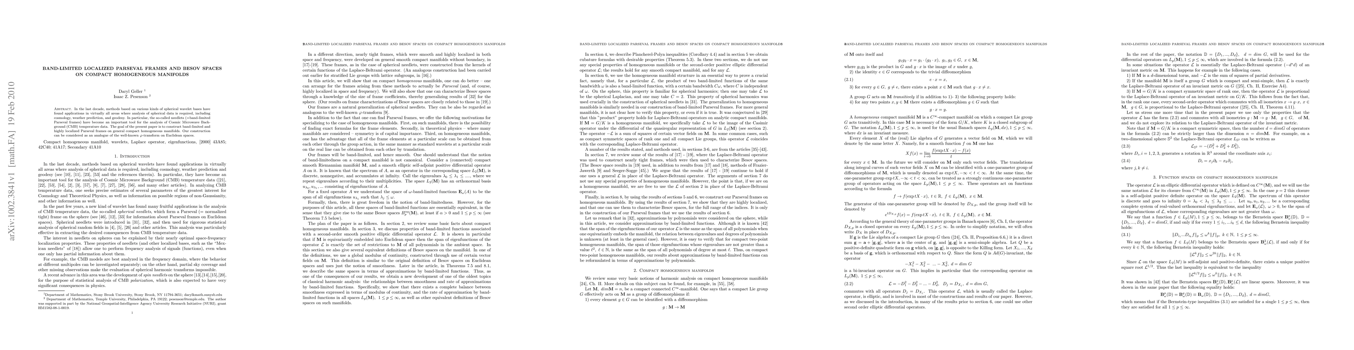This paper constructs band-limited and localized Parseval frames on compact homogeneous manifolds, analogous to the phi-transform in Euclidean spaces, which aids in analyzing spherical data like Cosmic Microwave Background temperature data. These frames are essential tools for various applications in cosmology and related fields.