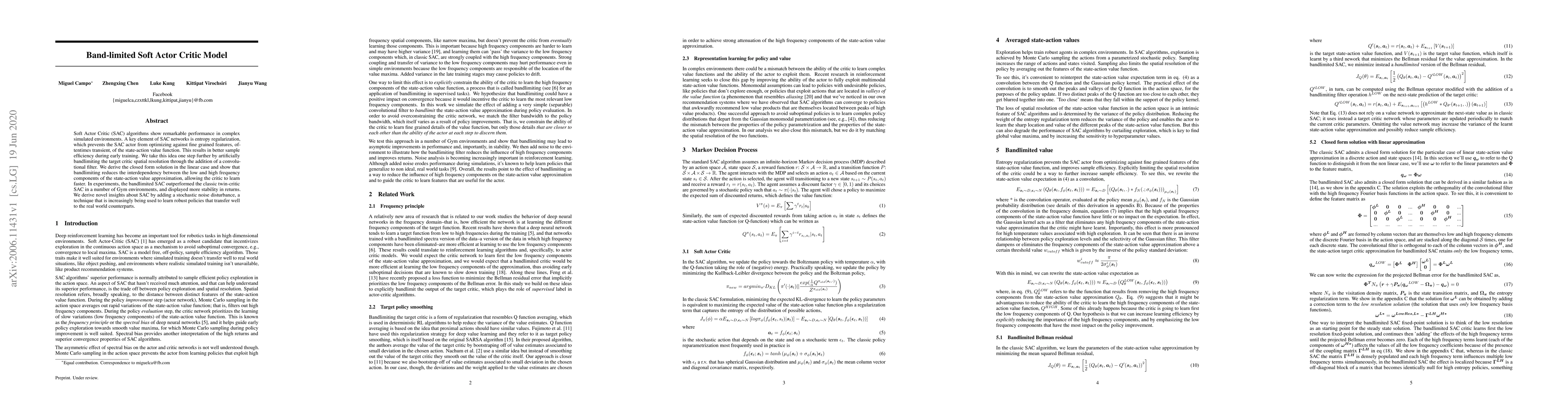 Soft Actor Critic (SAC) algorithms show remarkable performance in complex simulated environments. A key element of SAC networks is entropy regularization, which prevents the SAC actor from optimizing against fine grained features, oftentimes transient, of the state-action value function. This results in better sample efficiency during early training. We take this idea one step further by artificially bandlimiting the target critic spatial resolution through the addition of a convolutional filter. We derive the closed form solution in the linear case and show that bandlimiting reduces the interdependency between the low and high frequency components of the state-action value approximation, allowing the critic to learn faster. In experiments, the bandlimited SAC outperformed the classic twin-critic SAC in a number of Gym environments, and displayed more stability in returns. We derive novel insights about SAC by adding a stochastic noise disturbance, a technique that is increasingly being used to learn robust policies that transfer well to the real world counterparts.