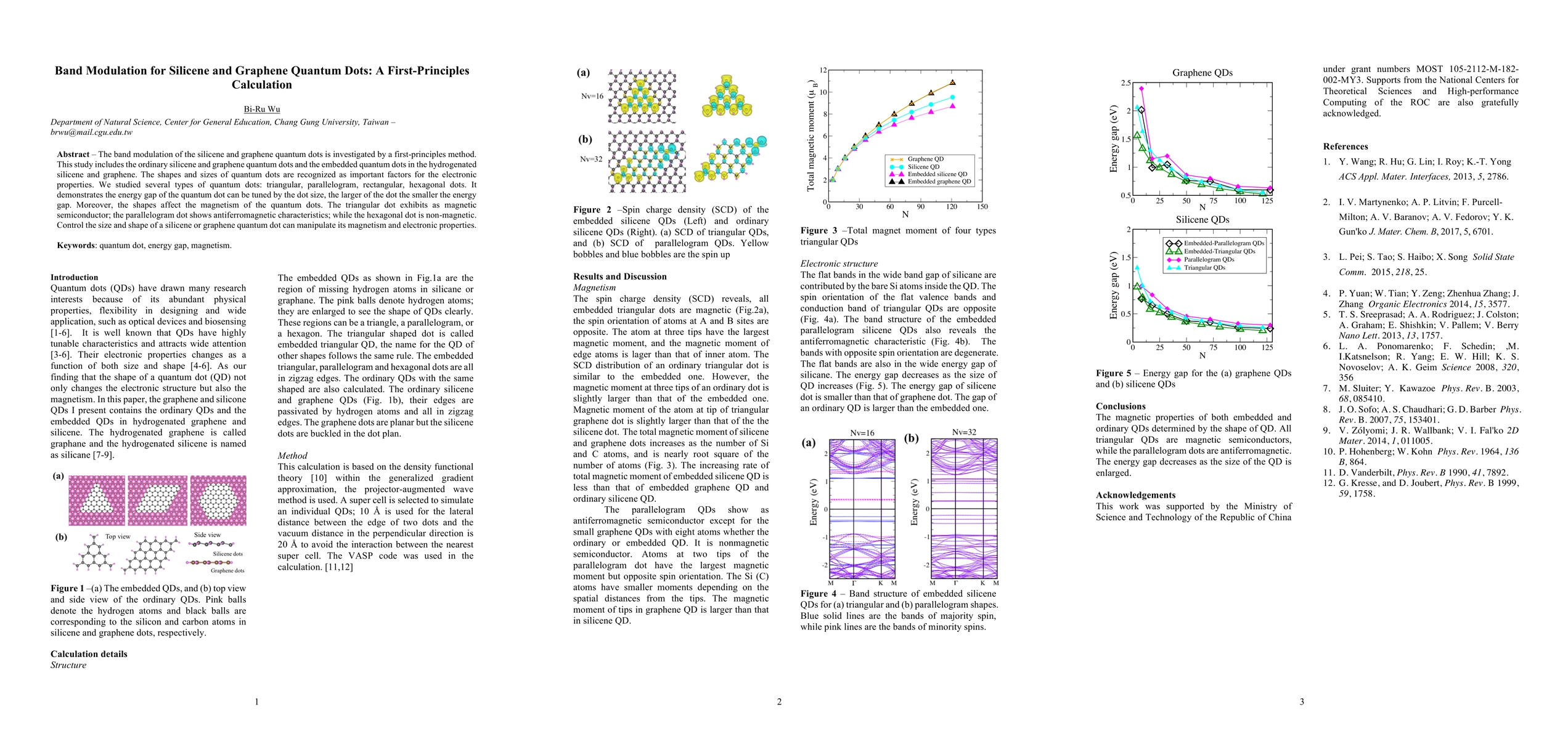 This research uses first-principles calculations to study the band modulation of silicene and graphene quantum dots of various shapes and sizes. It reveals that the energy gap can be tuned by dot size and shape, influencing their magnetism, such as magnetic semiconductor, antiferromagnetic, or non-magnetic properties.
