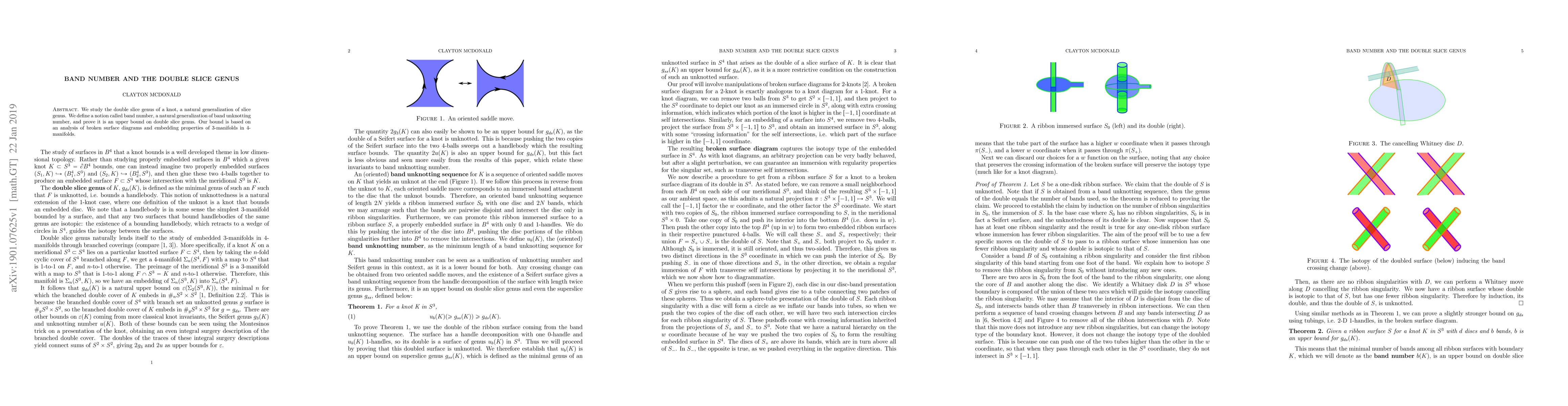 This paper introduces the concept of band number as a generalization of band unknotting number and proves it serves as an upper bound for the double slice genus of a knot, utilizing insights from broken surface diagrams and 3-manifold embeddings in 4-manifolds.