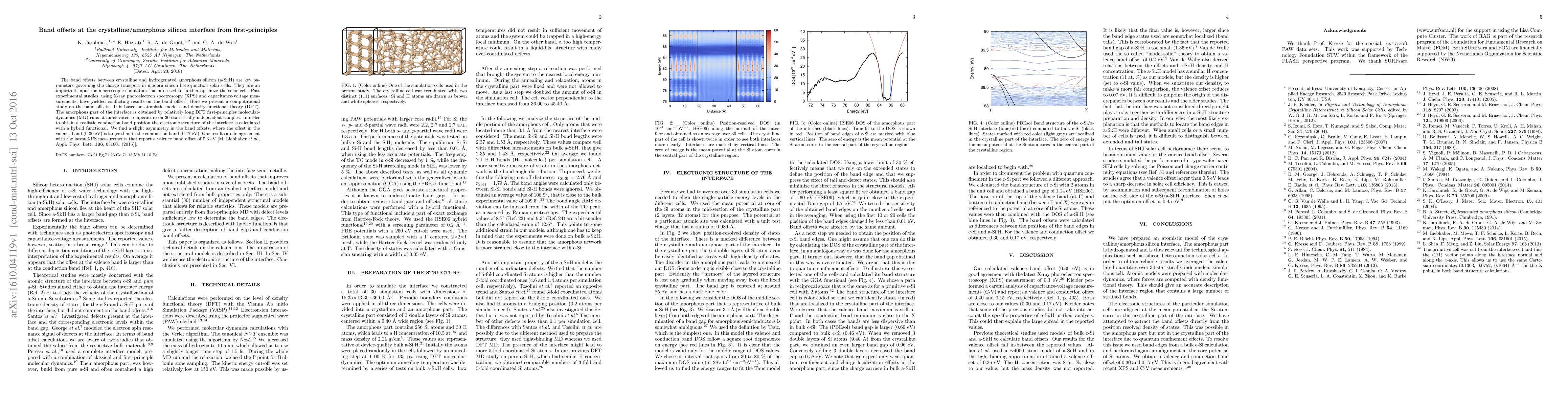 The band offsets between crystalline and hydrogenated amorphous silicon (a-Si:H) are key parameters governing the charge transport in modern silicon hetrojunction solar cells. They are an important input for macroscopic simulators that are used to further optimize the solar cell. Past experimental studies, using X-ray photoelectron spectroscopy (XPS) and capacitance-voltage measurements, have yielded conflicting results on the band offset. Here we present a computational study on the band offsets. It is based on atomistic models and density-functional theory (DFT). The amorphous part of the interface is obtained by relatively long DFT first-principles molecular-dynamics (MD) runs at an elevated temperature on 30 statistically independent samples. In order to obtain a realistic conduction band position the electronic structure of the interface is calculated with a hybrid functional. We find a slight asymmetry in the band offsets, where the offset in the valence band (0.30 eV) is larger than in the conduction band (0.17 eV). Our results are in agreement with the latest XPS measurements that report a valence band offset of 0.3 eV [M. Liebhaber et al., Appl. Phys. Lett. 106, 031601 (2015)].