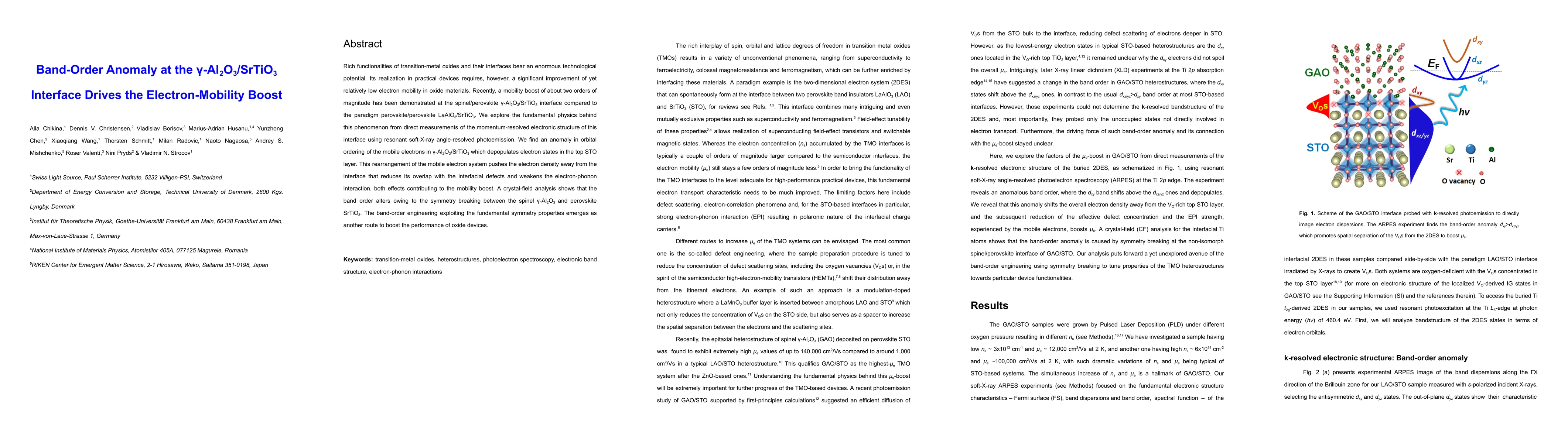 The research paper investigates a significant electron-mobility boost at the {\gamma}-Al2O3/SrTiO3 interface, attributing it to a band-order anomaly that depopulates electron states in the top SrTiO3 layer. This orbital ordering rearrangement reduces electron-phonon interaction and weakens overlap with interfacial defects, enhancing mobility.