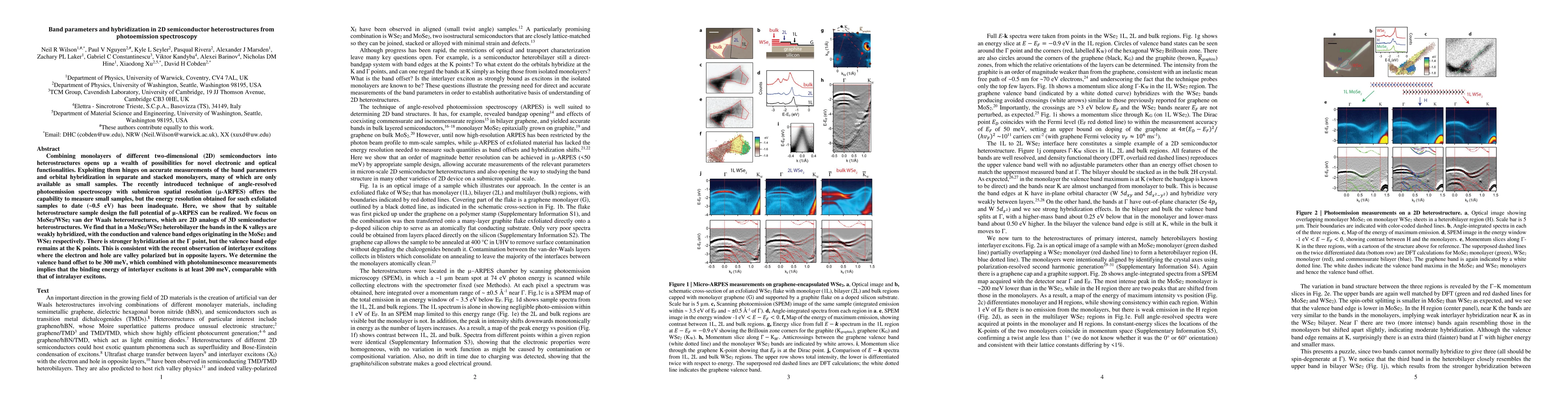 Combining monolayers of different two-dimensional (2D) semiconductors into heterostructures opens up a wealth of possibilities for novel electronic and optical functionalities. Exploiting them hinges on accurate measurements of the band parameters and orbital hybridization in separate and stacked monolayers, many of which are only available as small samples. The recently introduced technique of angle-resolved photoemission spectroscopy with submicron spatial resolution ({\mu}-ARPES) offers the capability to measure small samples, but the energy resolution obtained for such exfoliated samples to date (~0.5 eV) has been inadequate. Here, we show that by suitable heterostructure sample design the full potential of {\mu}-ARPES can be realized. We focus on MoSe2/WSe2 van der Waals heterostructures, which are 2D analogs of 3D semiconductor heterostructures. We find that in a MoSe2/WSe2 heterobilayer the bands in the K valleys are weakly hybridized, with the conduction and valence band edges originating in the MoSe2 and WSe2 respectively. There is stronger hybridization at the {\Gamma} point, but the valence band edge remains at the K points. This is consistent with the recent observation of interlayer excitons where the electron and hole are valley polarized but in opposite layers. We determine the valence band offset to be 300 meV, which combined with photoluminescence measurements implies that the binding energy of interlayer excitons is at least 200 meV, comparable with that of intralayer excitons.