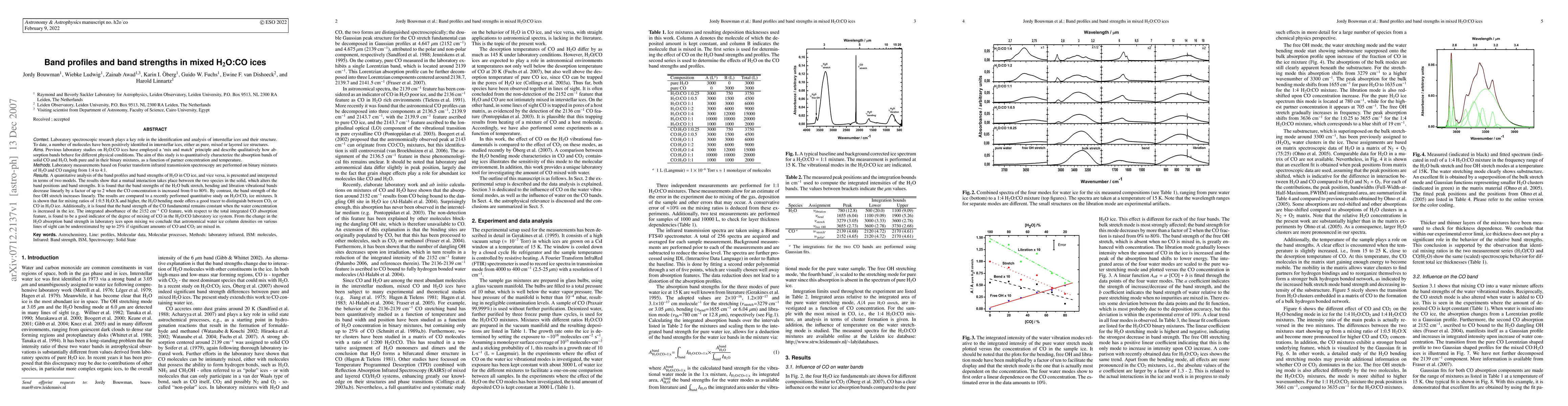 This study investigates the band profiles and strengths in mixed H2O:CO ices, revealing a mutual interaction that shifts band positions and reduces H2O band strengths by up to 2x with increasing CO concentration. The H2O bending mode serves as a tracer for distinguishing CO from CO2 in H2O ice, while CO band strengths remain constant, suggesting a method for assessing CO mixing ratios in astronomical water ice studies.