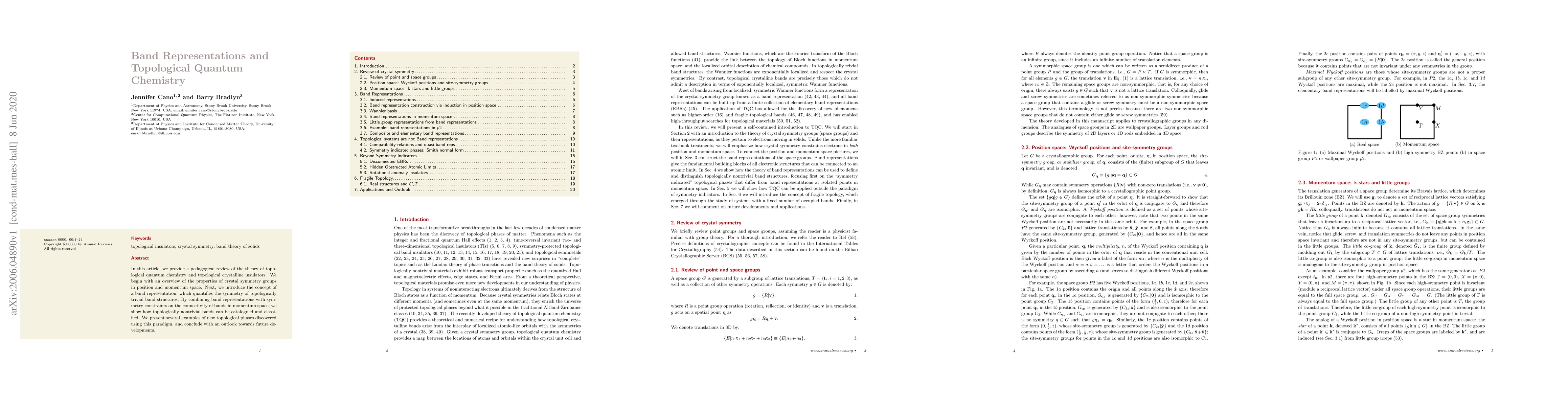 In this article, we provide a pedagogical review of the theory of topological quantum chemistry and topological crystalline insulators. We begin with an overview of the properties of crystal symmetry groups in position and momentum space. Next, we introduce the concept of a band representation, which quantifies the symmetry of topologically trivial band structures. By combining band representations with symmetry constraints on the connectivity of bands in momentum space, we show how topologically nontrivial bands can be catalogued and classified. We present several examples of new topological phases discovered using this paradigm, and conclude with an outlook towards future developments.