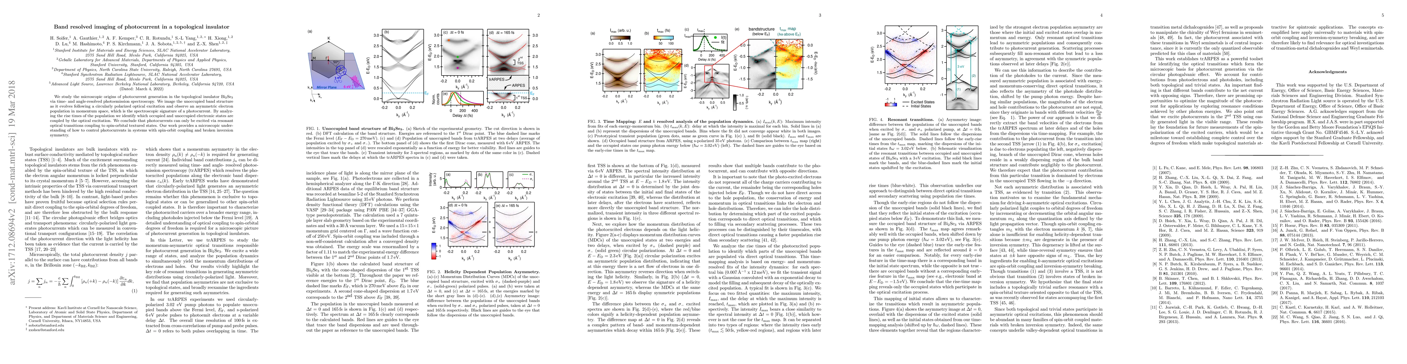 We study the microscopic origins of photocurrent generation in the topological insulator Bi$_2$Se$_3$ via time- and angle-resolved photoemission spectroscopy. We image the unoccupied band structure as it evolves following a circularly polarized optical excitation and observe an asymmetric electron population in momentum space, which is the spectroscopic signature of a photocurrent. By analyzing the rise times of the population we identify which occupied and unoccupied electronic states are coupled by the optical excitation. We conclude that photocurrents can only be excited via resonant optical transitions coupling to spin-orbital textured states. Our work provides a microscopic understanding of how to control photocurrents in systems with spin-orbit coupling and broken inversion symmetry.