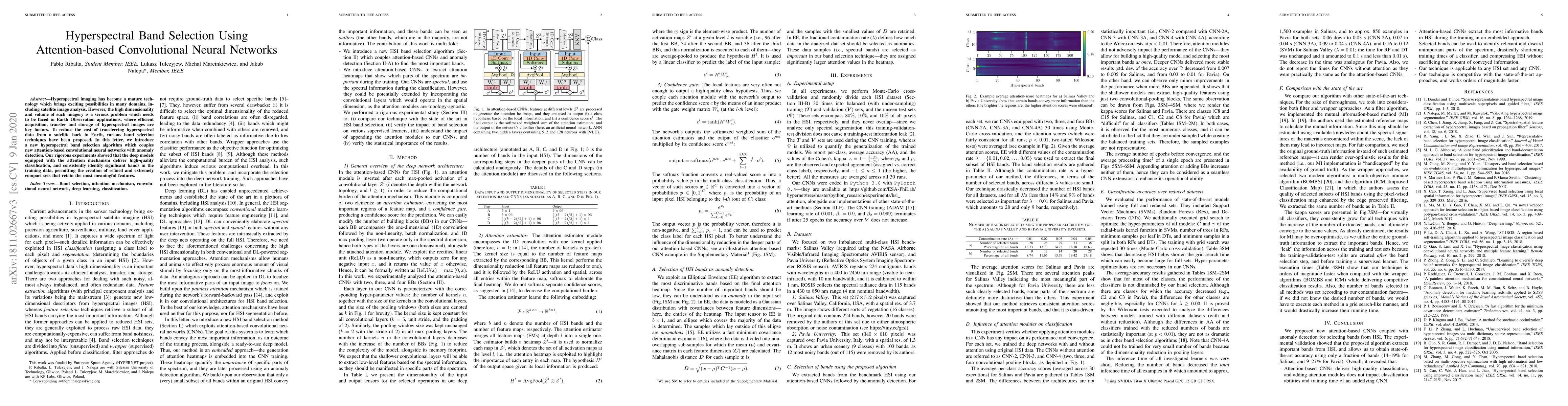 This paper introduces new attention-based convolutional neural networks for selecting bands from hyperspectral images. The proposed approach re-uses convolutional activations at different depths, identifying the most informative regions of the spectrum with the help of gating mechanisms. Our attention techniques are modular and easy to implement, and they can be seamlessly trained end-to-end using gradient descent. Our rigorous experiments showed that deep models equipped with the attention mechanism deliver high-quality classification, and repeatedly identify significant bands in the training data, permitting the creation of refined and extremely compact sets that retain the most meaningful features.