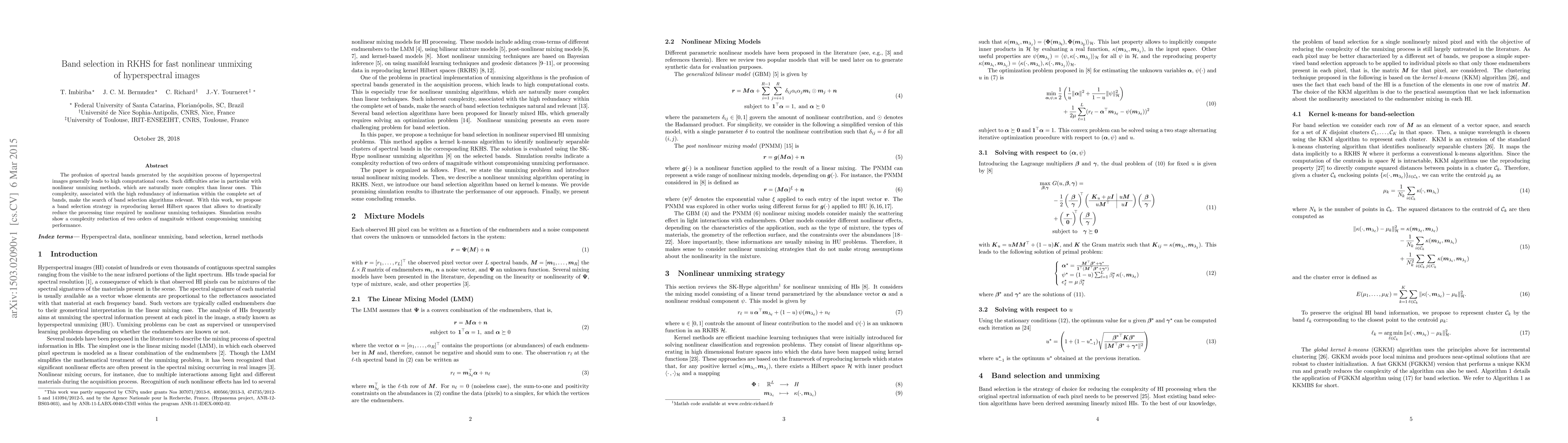 This paper proposes a band selection strategy in reproducing kernel Hilbert spaces to reduce computational costs for nonlinear unmixing of hyperspectral images. The method achieves a two-order reduction in processing time without compromising unmixing performance, demonstrating significant efficiency gains.