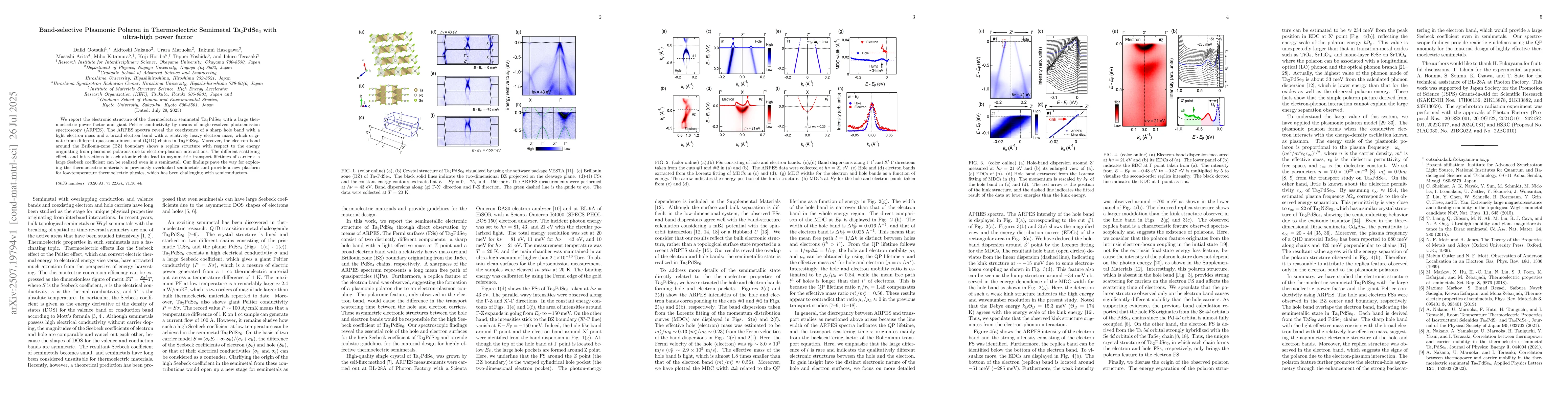 We report the electronic structure of the thermoelectric semimetal Ta$_2$PdSe$_6$ with a large thermoelectric power factor and giant Peltier conductivity by means of angle-resolved photoemission spectroscopy (ARPES). The ARPES spectra reveal the coexistence of a sharp hole band with a light electron mass and a broad electron band with a relatively heavy electron mass, which originate from different quasi-one-dimensional (Q1D) chains in Ta$_2$PdSe$_6$. Moreover, the electron band around the Brillouin-zone (BZ) boundary shows a replica structure with respect to the energy originating from plasmonic polarons due to electron-plasmon interactions. The different scattering effects and interactions in each atomic chain lead to asymmetric transport lifetimes of carriers: a large Seebeck coefficient can be realized even in a semimetal. Our findings pave the way for exploring the thermoelectric materials in previously overlooked semimetals and provide a new platform for low-temperature thermoelectric physics, which has been challenging with semiconductors.