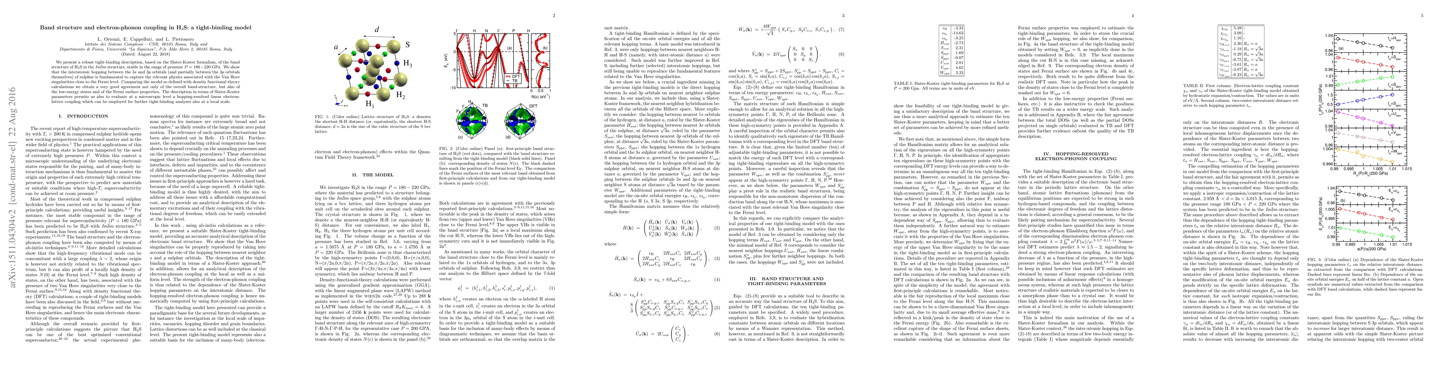 This paper develops a tight-binding model for H$_3$S using the Slater-Koster formalism to describe its band structure and electron-phonon coupling, showing good agreement with density functional theory calculations and highlighting the importance of interatomic hopping between sulfur's 3$s$ and 3$p$ orbitals. The model also allows for a detailed evaluation of electron-lattice coupling at a microscopic level.