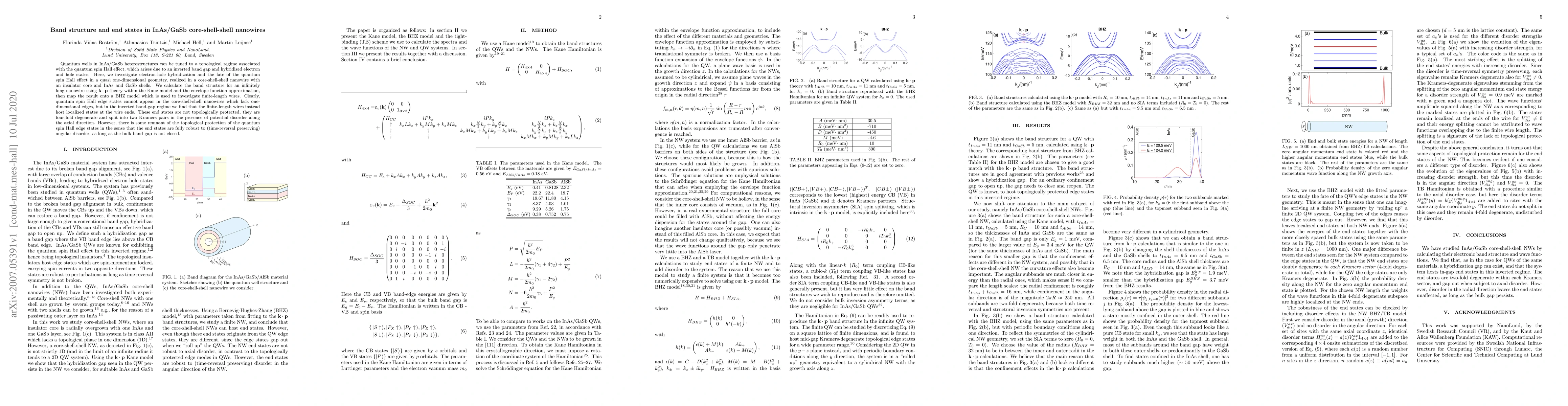 This study explores the band structure and electron-hole hybridization in InAs/GaSb core-shell-shell nanowires, revealing that while quantum spin Hall edge states do not form due to the lack of one-dimensional edges, the nanowires host four-fold degenerate localized end states that retain robustness against angular disorder when the bulk band gap remains open.