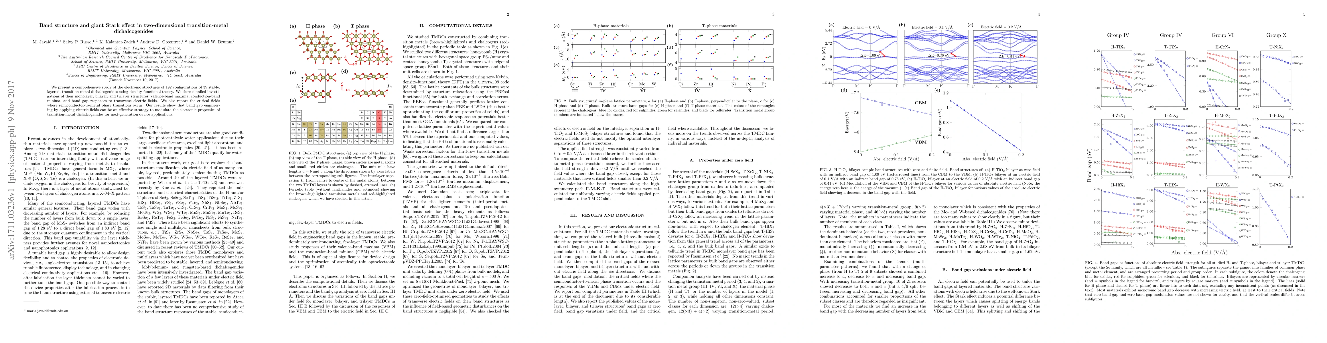 We present a comprehensive study of the electronic structures of 192 configurations of 39 stable, layered, transition-metal dichalcogenides using density-functional theory. We show detailed investigations of their monolayer, bilayer, and trilayer structures' valence-band maxima, conduction-band minima, and band gap responses to transverse electric fields. We also report the critical fields where semiconductor-to-metal phase transitions occur. Our results show that band gap engineering by applying electric fields can be an effective strategy to modulate the electronic properties of transition-metal dichalcogenides for next-generation device applications.