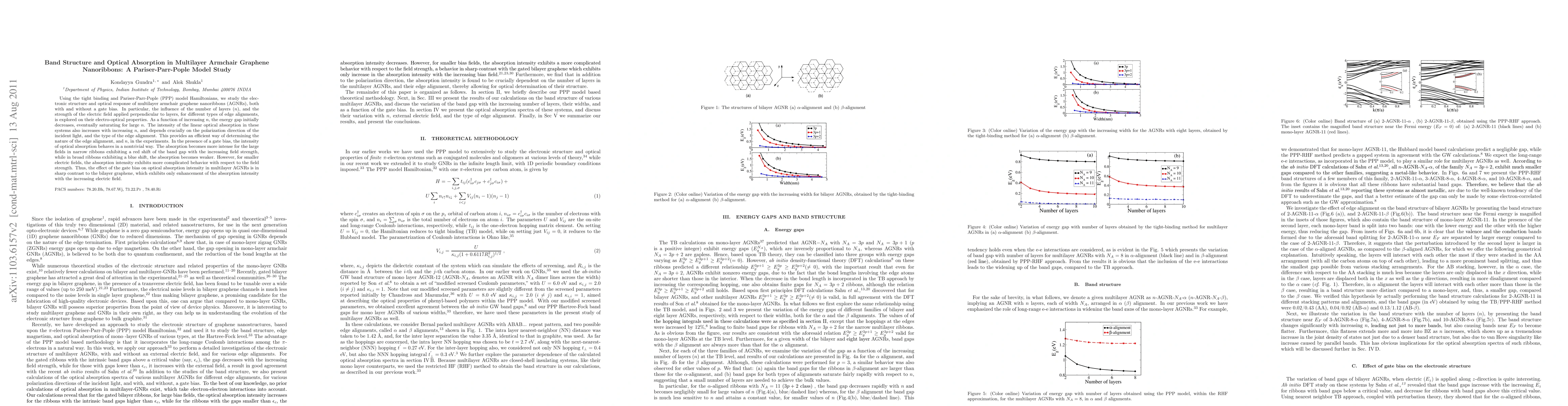 This study uses the Pariser-Parr-Pople model to investigate the electronic structure and optical absorption of multilayer armchair graphene nanoribbons, finding that the energy gap decreases and optical absorption increases with the number of layers, while gate bias induces complex changes in absorption intensity dependent on ribbon width and electric field strength.