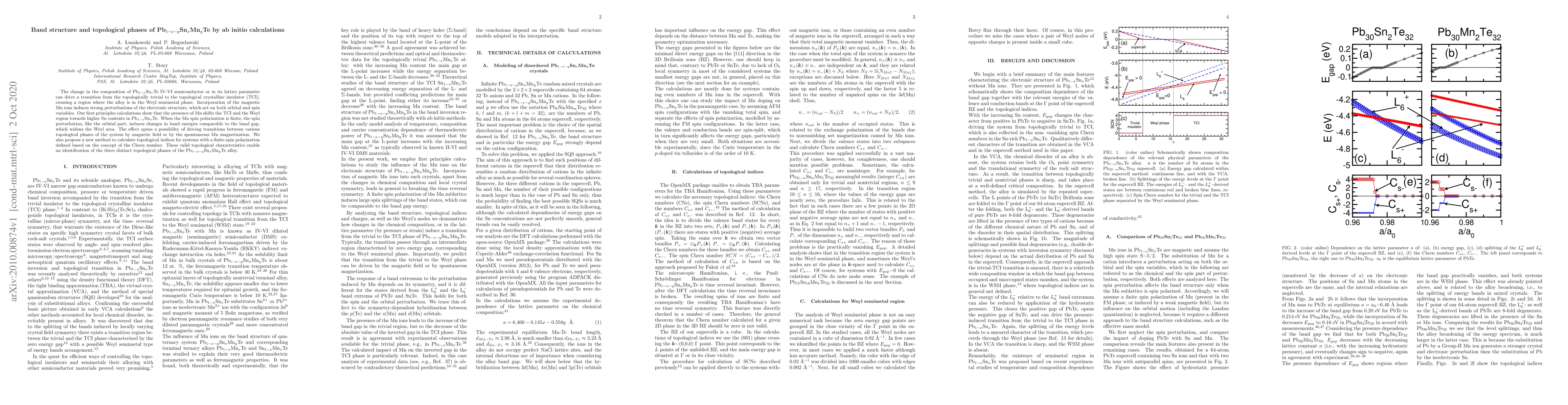 The change in the composition of Pb$_{1-x}$Sn$_x$Te IV-VI semiconductor or in its lattice parameter can drive a transition from the topologically trivial to the topological crystalline insulator (TCI), crossing a region where the alloy is in the Weyl semimetal phase. Incorporation of the magnetic Mn ions induces strong perturbations of the electronic structure, which act on both orbital and spin variables. Our first principles calculations show that the presence of Mn shifts the TCI and the Weyl region towards higher Sn contents in Pb$_{1-x}$Sn$_x$Te. When the Mn spin polarization is finite, the spin perturbation, like the orbital part, induces changes in band energies comparable to the band gap, which widens the Weyl area. The effect opens a possibility of driving transitions between various topological phases of the system by magnetic field or by the spontaneous Mn magnetization. We also propose a new method to calculate topological indices for systems with a finite spin polarization defined based on the concept of the Chern number. These valid topological characteristics enable an identification of the three distinct topological phases of the Pb$_{1-x-y}$Sn$_x$Mn$_y$Te alloy.