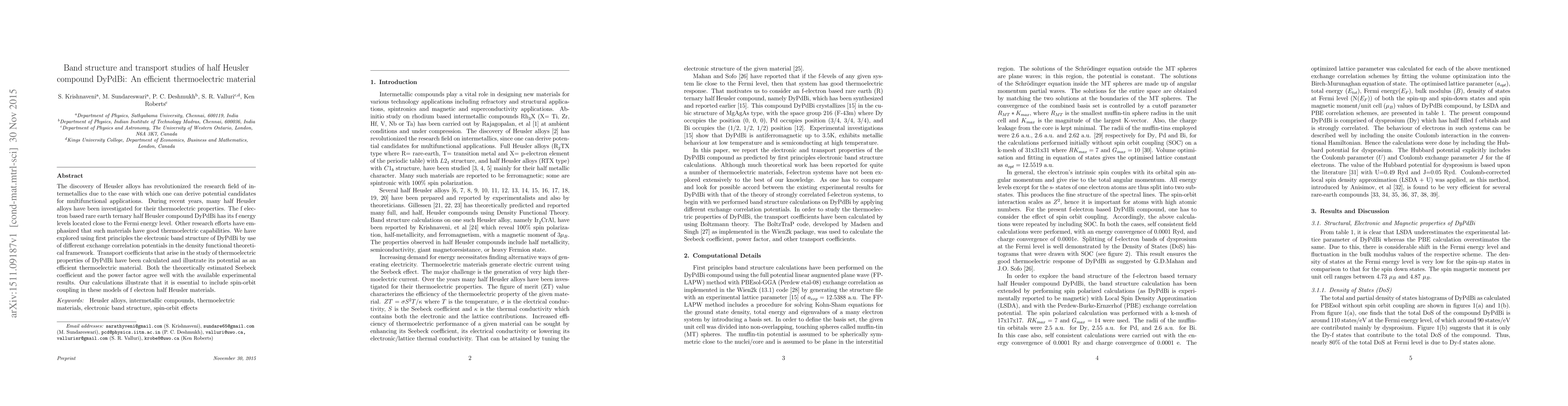 The discovery of Heusler alloys has revolutionized the research field of intermetallics due to the ease with which one can derive potential candidates for multifunctional applications. During recent years, many half Heusler alloys have been investigated for their thermoelectric properties. The f electron based rare earth ternary half Heusler compound DyPdBi has its f energy levels located close to the Fermi energy level. Other research efforts have emphasized that such materials have good thermoelectric capabilities. We have explored using first principles the electronic band structure of DyPdBi by use of different exchange correlation potentials in the density functional theoretical framework. Transport coefficients that arise in the study of thermoelectric properties of DyPdBi have been calculated and illustrate its potential as an efficient thermoelectric material. Both the theoretically estimated Seebeck coefficient and the power factor agree well with the available experimental results. Our calculations illustrate that it is essential to include spin-orbit coupling in these models of f electron half Heusler materials.