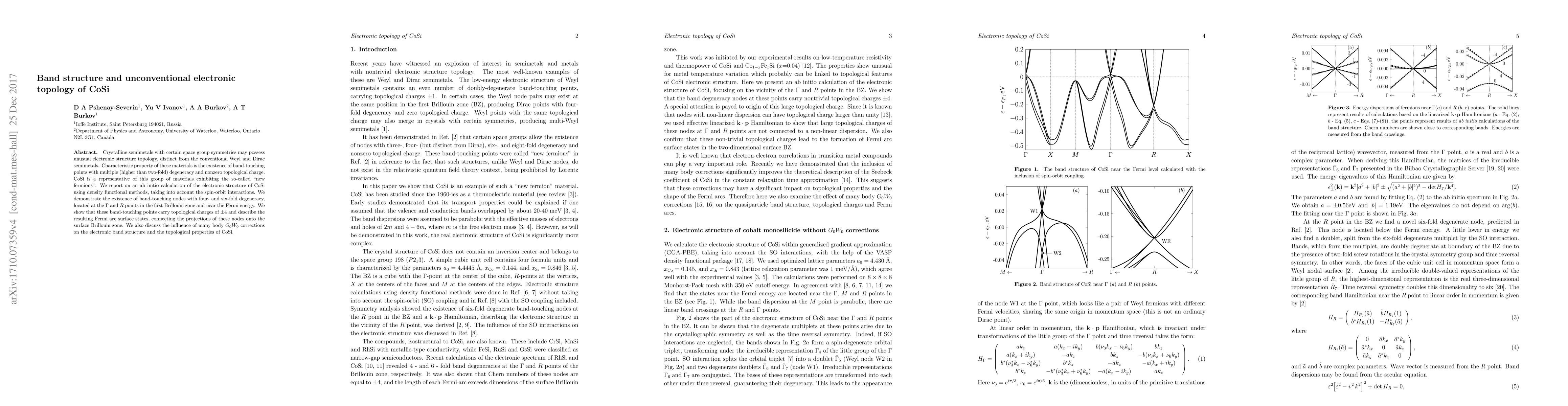 The paper presents detailed ab initio calculations of CoSi's electronic structure, including spin-orbit interactions and many-body corrections, revealing new fermionic nodes and their topological charges.