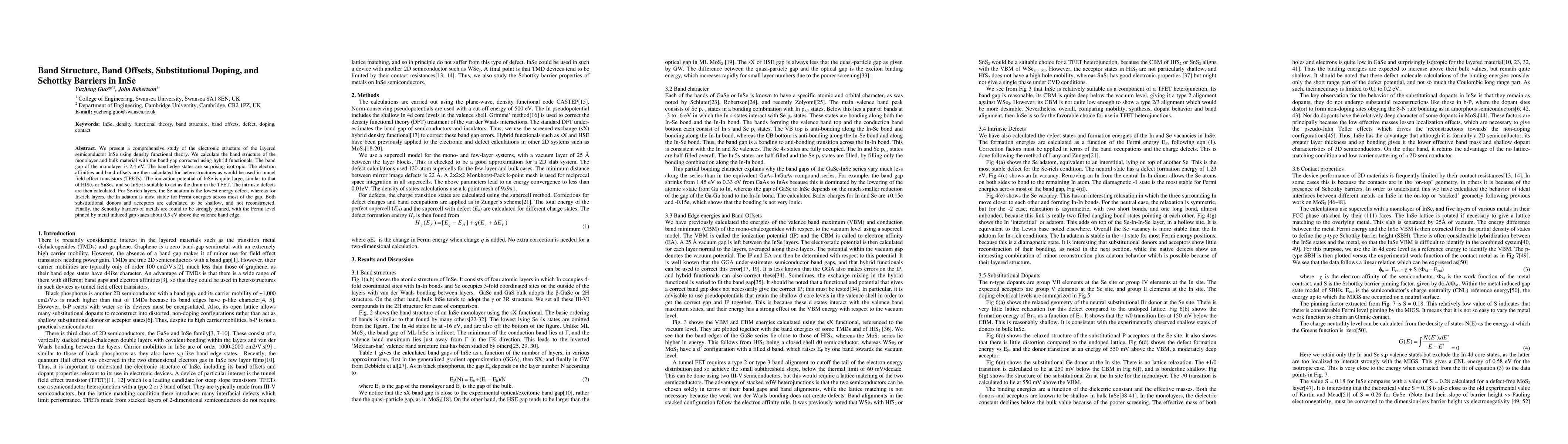 This study uses density functional theory to analyze the electronic structure of InSe, finding a 2.4 eV band gap in monolayers and calculating band offsets for potential TFET applications. It also investigates intrinsic defects and finds Schottky barriers to be strongly pinned by metal-induced gap states.