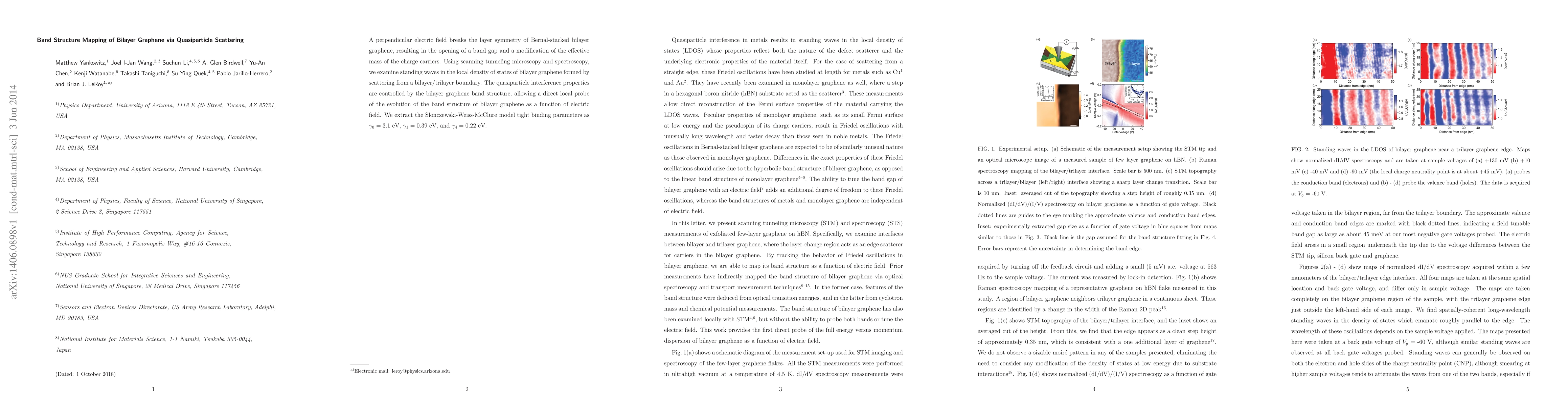 This research uses scanning tunneling microscopy to investigate the band structure of bilayer graphene under a perpendicular electric field, revealing standing waves and quasiparticle interference patterns that map the changes in band gap and effective mass. The study extracts tight binding model parameters, highlighting the impact of electric fields on the material's properties.
