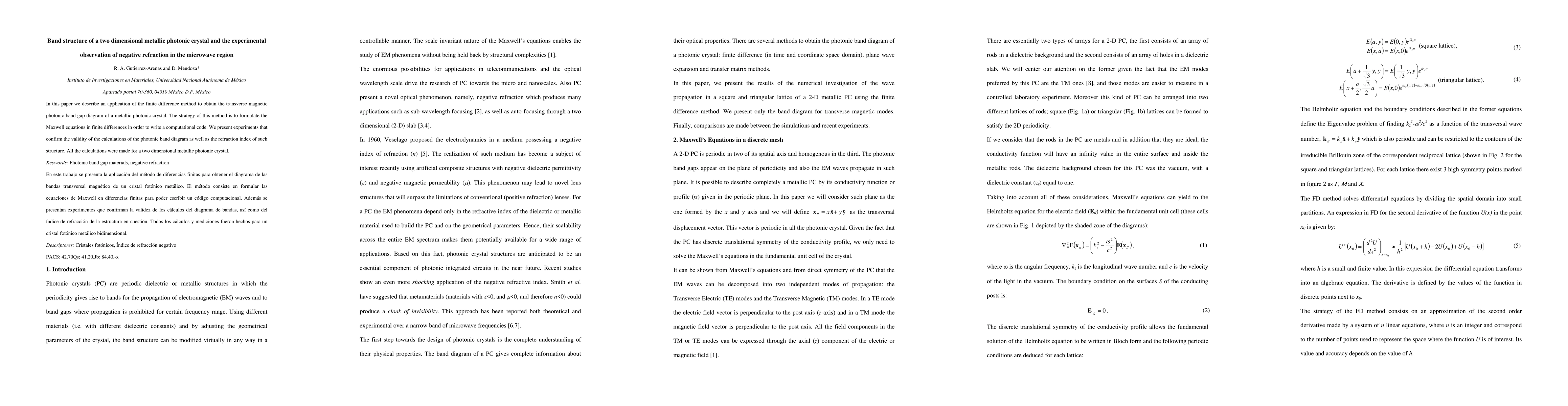 This paper uses a finite difference method to compute the photonic band gap of a two-dimensional metallic photonic crystal and experimentally verifies negative refraction in the microwave region, confirming the theoretical calculations.