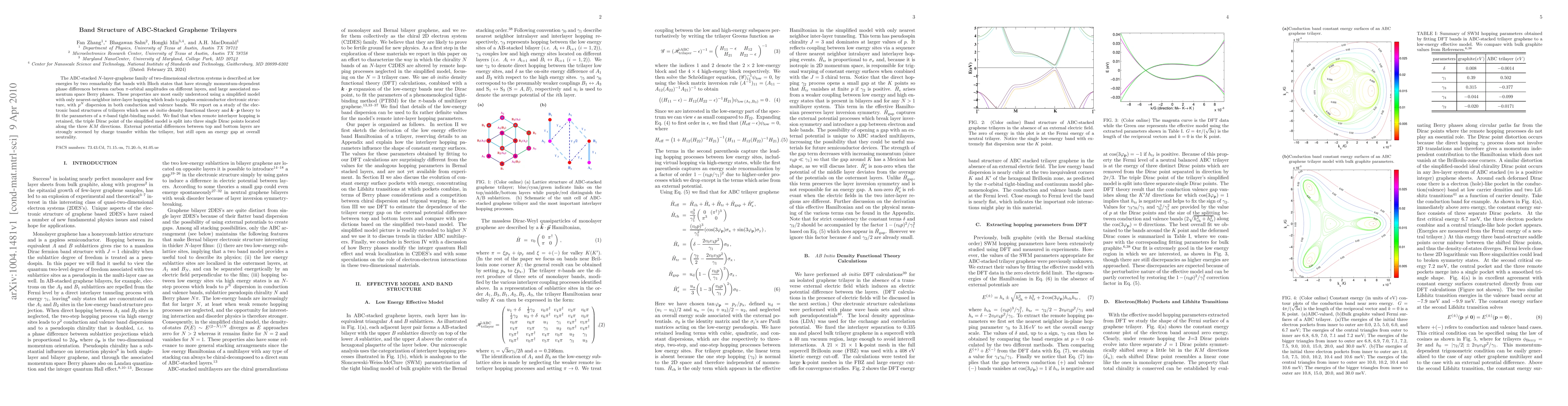 The ABC-stacked N-layer-graphene family of two-dimensional electron systems is described at low energies by two remarkably flat bands with Bloch states that have strongly momentum-dependent phase differences between carbon pi-orbital amplitudes on different layers, and large associated momentum space Berry phases. These properties are most easily understood using a simplified model with only nearest-neighbor inter-layer hopping which leads to gapless semiconductor electronic structure, with p^N dispersion in both conduction and valence bands. We report on a study of the electronic band structures of trilayers which uses ab initio density functional theory and k*p theory to fit the parameters of a pi-band tight-binding model. We find that when remote interlayer hopping is retained, the triple Dirac point of the simplified model is split into three single Dirac points located along the three KM directions. External potential differences between top and bottom layers are strongly screened by charge transfer within the trilayer, but still open an energy gap at overall neutrality.