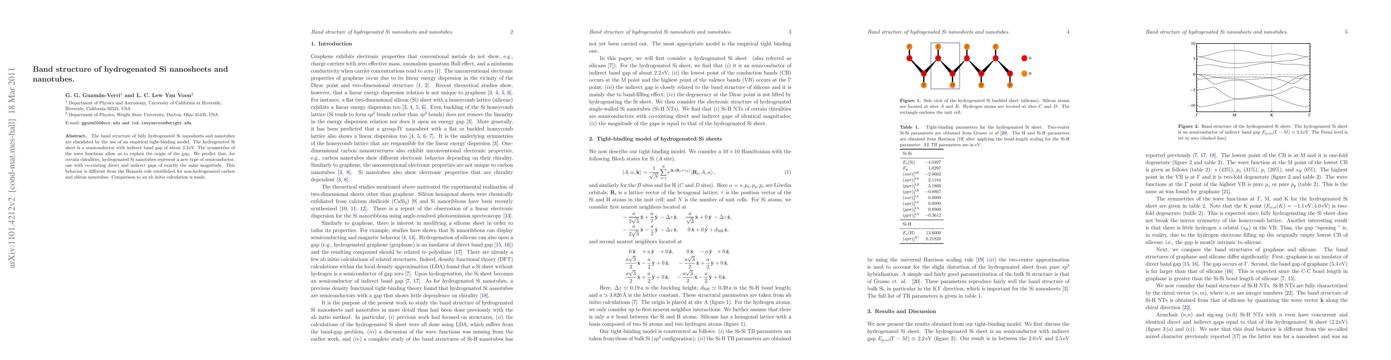 The research elucidates the band structure of fully hydrogenated silicon nanosheets and nanotubes using an empirical tight-binding model, revealing an indirect band gap of 2.2 eV in sheets and a unique coexistence of direct and indirect gaps of equal magnitude in certain chiral nanotubes, deviating from established rules for non-hydrogenated counterparts. Comparisons with ab initio calculations validate these predictions.