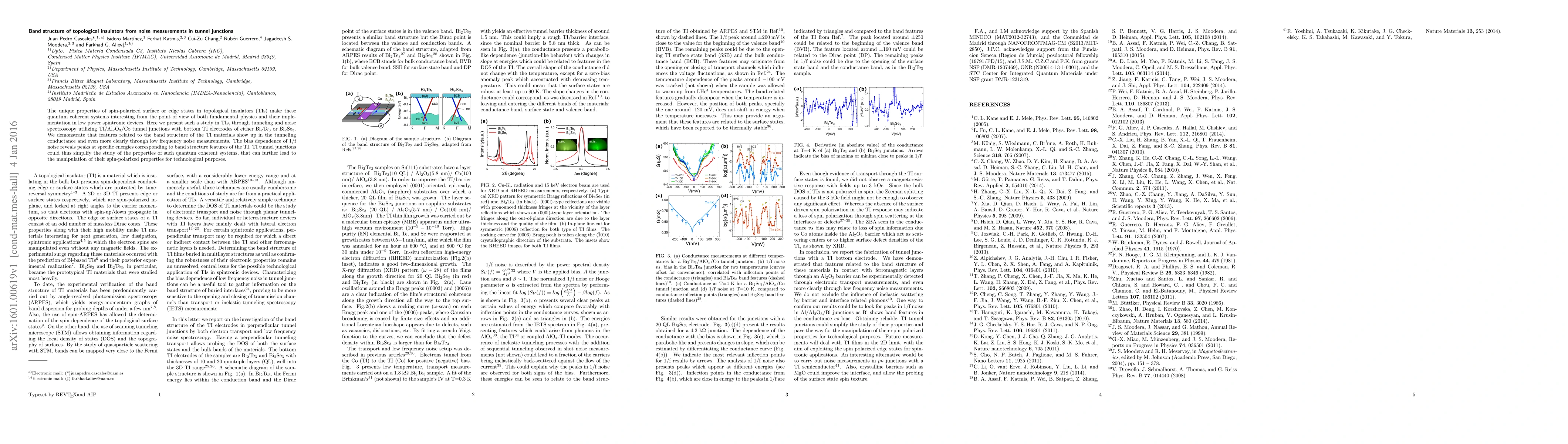 This paper investigates the band structure of topological insulators (TIs) using TI/Al$_2$O$_3$/Co tunnel junctions and noise spectroscopy, revealing band structure features through low-frequency noise measurements. The study suggests that TI tunnel junctions can simplify the study of TI properties and potentially enable manipulation of their spin-polarized states for future spintronic devices.