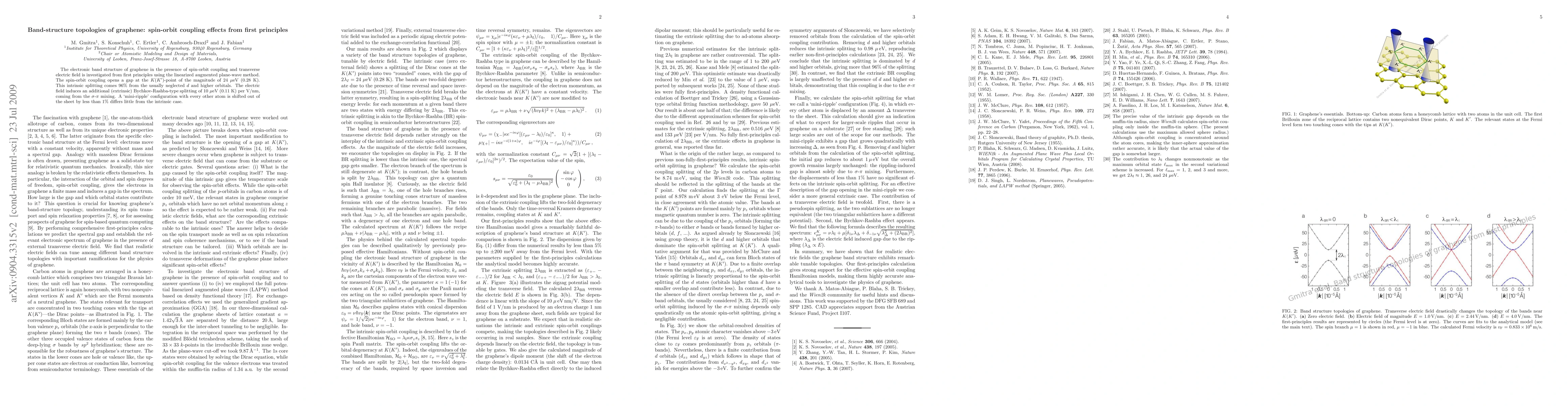 This study investigates graphene's electronic band structure under spin-orbit coupling and transverse electric fields using first principles. Spin-orbit coupling opens a 24 μeV gap at the K(K') point, primarily from d and higher orbitals, while an electric field induces an additional 10 μeV per V/nm extrinsic splitting due to σ-π mixing.