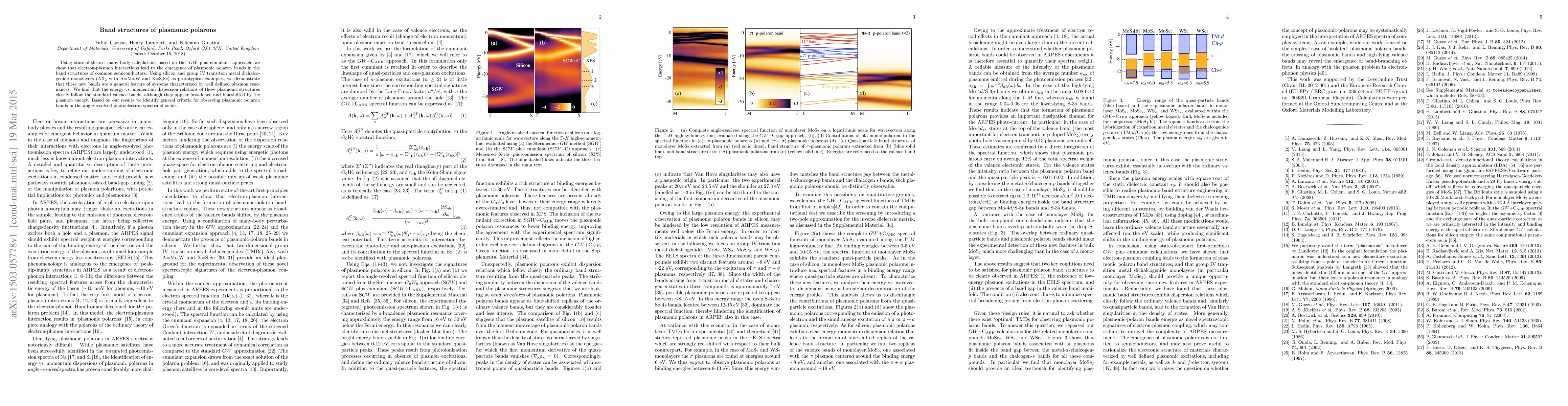 Using state-of-the-art many-body calculations based on the `GW plus cumulant' approach, we show that electron-plasmon interactions lead to the emergence of plasmonic polaron bands in the band structures of common semiconductors. Using silicon and group IV transition metal dichalcogenide monolayers (AX2 with A=Mo,W and X=S,Se) as prototypical examples, we demonstrate that these new bands are a general feature of systems characterized by well defined plasmon resonances. We find that the energy vs. momentum dispersion relations of these plasmonic structures closely follow the standard valence bands, although they appear broadened and blueshifted by the plasmon energy. Based on our results we identify general criteria for observing plasmonic polaron bands in the angle-resolved photoelectron spectra of solids.