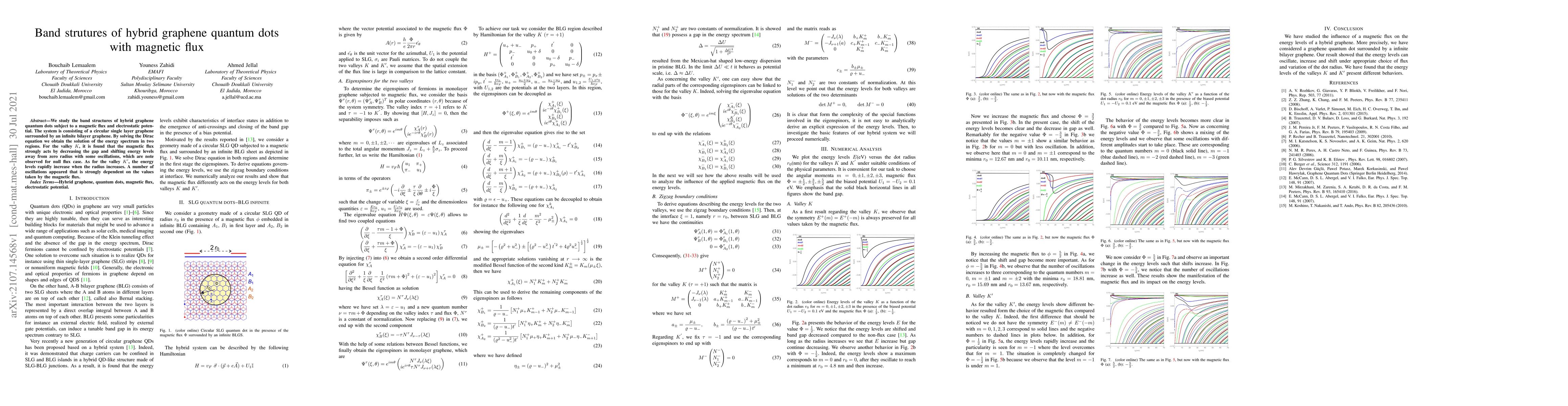 This research investigates the band structures of hybrid graphene quantum dots under magnetic flux and electrostatic potential, finding that magnetic flux decreases the gap and shifts energy levels in valley $K$, while energy levels in valley $K'$ rapidly increase with radius and show oscillations dependent on the magnetic flux.