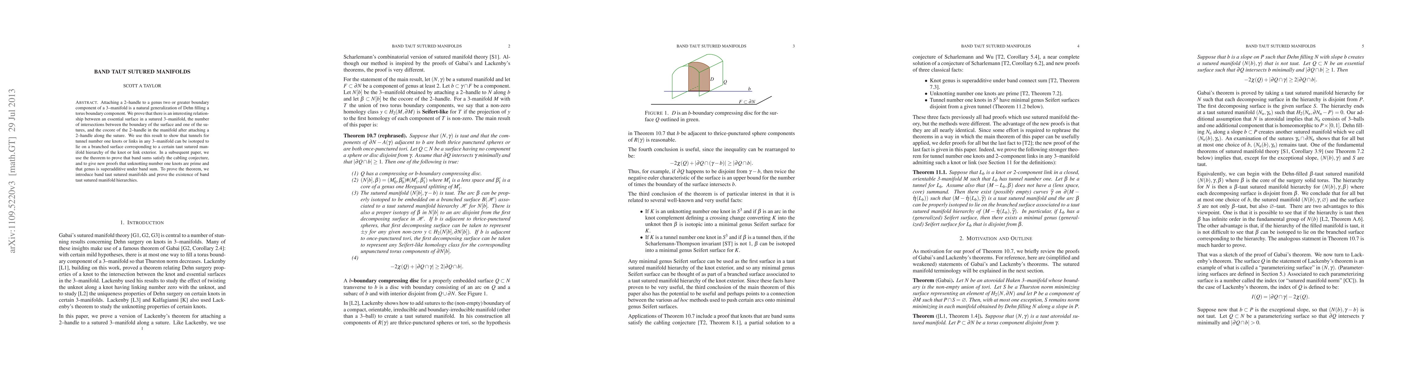 Attaching a 2-handle to a genus two or greater boundary component of a 3-manifold is a natural generalization of Dehn filling a torus boundary component. We prove that there is an interesting relationship between an essential surface in a sutured 3-manifold, the number of intersections between the boundary of the surface and one of the sutures, and the cocore of the 2-handle in the manifold after attaching a 2-handle along the suture. We use this result to show that tunnels for tunnel number one knots or links in any 3-manifold can be isotoped to lie on a branched surface corresponding to a certain taut sutured manifold hierarchy of the knot or link exterior. In a subsequent paper, we use the theorem to prove that band sums satisfy the cabling conjecture, and to give new proofs that unknotting number one knots are prime and that genus is superadditive under band sum. To prove the theorem, we introduce band taut sutured manifolds and prove the existence of band taut sutured manifold hierarchies.