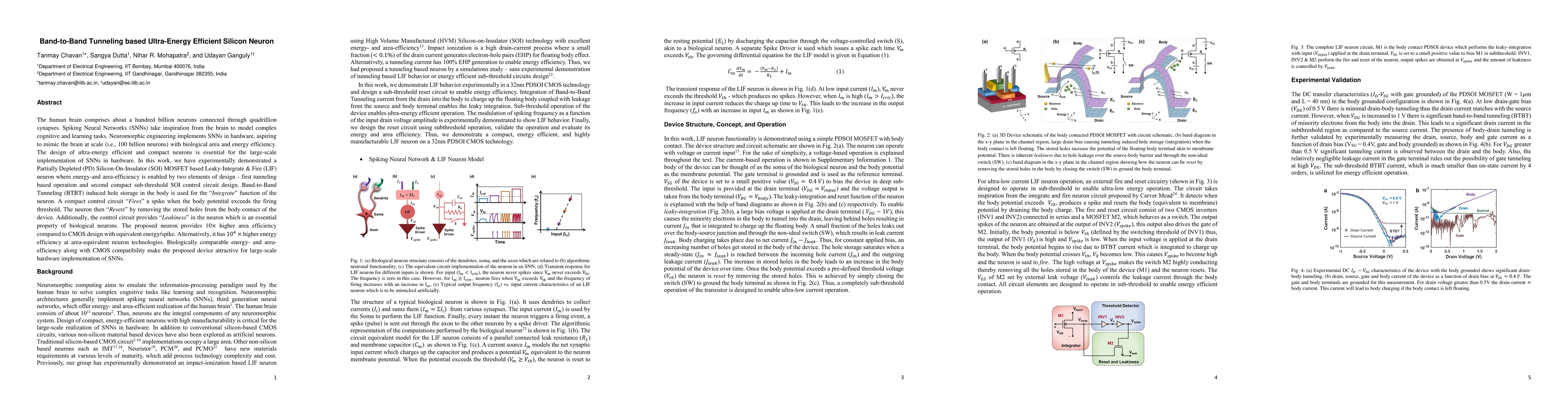 This paper presents an ultra-energy efficient silicon neuron based on Partially Depleted Silicon-On-Insulator MOSFETs utilizing Band-to-Band Tunneling for hole storage, achieving 10x higher area efficiency and 10^4x higher energy efficiency compared to CMOS designs. The design mimics biological neuron properties with a compact control circuit for spiking and leakiness.