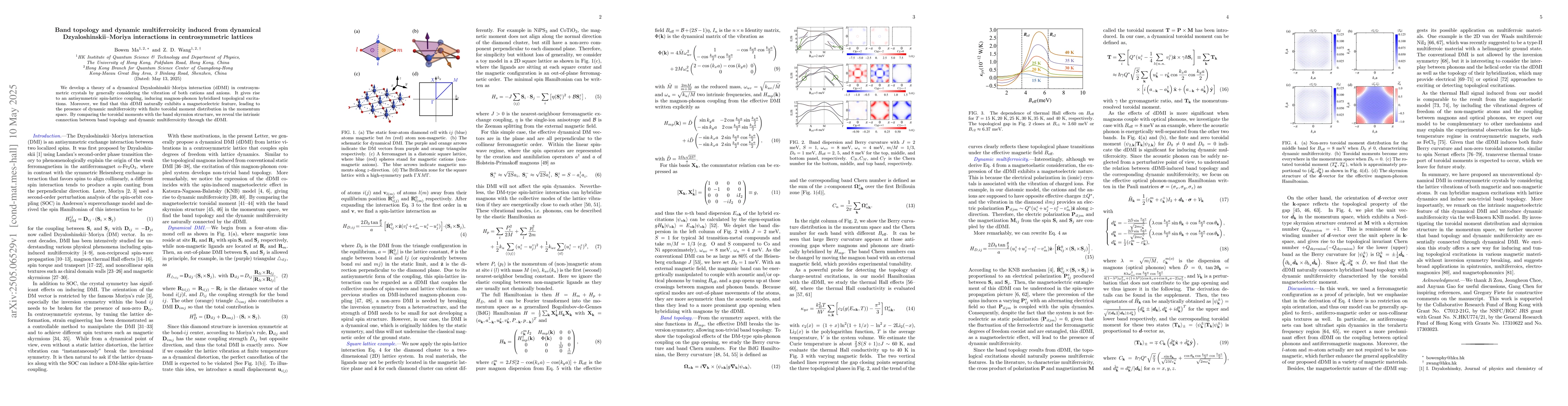 The research develops a theory of a dynamical Dzyaloshinskii-Moriya interaction (dDMI) in centrosymmetric crystals, considering cation and anion vibrations, leading to antisymmetric spin-lattice coupling and magnon-phonon hybridized topological excitations.