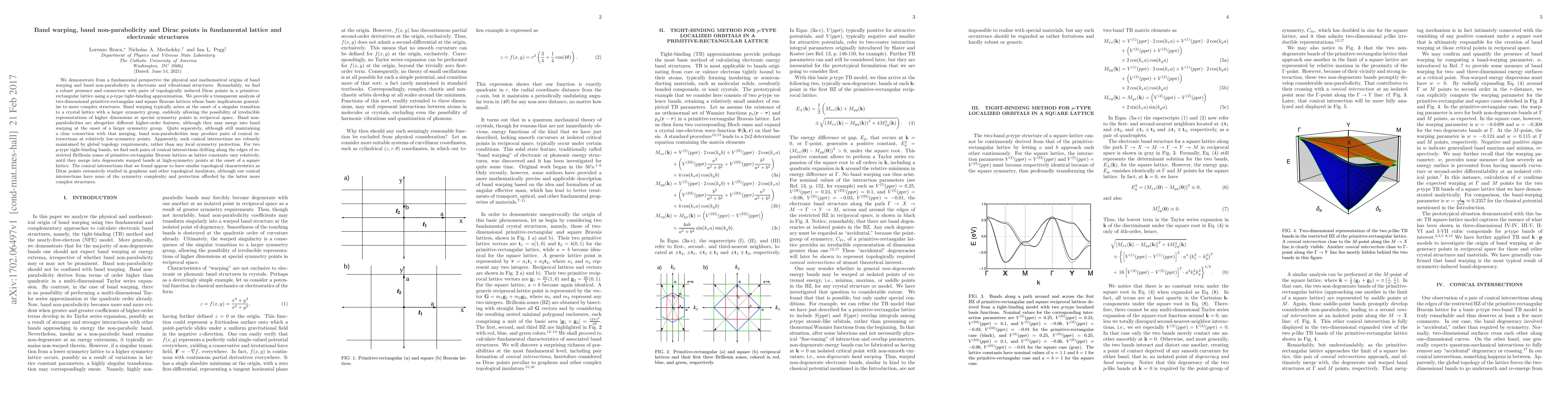 We demonstrate from a fundamental perspective the physical and mathematical origins of band warping and band non-parabolicity in electronic and vibrational structures. Remarkably, we find a robust presence and connection with pairs of topologically induced Dirac points in a primitive-rectangular lattice using a $p$-type tight-binding approximation. We provide a transparent analysis of two-dimensional primitive-rectangular and square Bravais lattices whose basic implications generalize to more complex structures. Band warping typically arises at the onset of a singular transition to a crystal lattice with a larger symmetry group, suddenly allowing the possibility of irreducible representations of higher dimensions at special symmetry points in reciprocal space. Band non-parabolicities are altogether different higher-order features, although they may merge into band warping at the onset of a larger symmetry group. Quite separately, although still maintaining a clear connection with that merging, band non-parabolicities may produce pairs of conical intersections at relatively low-symmetry points. Apparently, such conical intersections are robustly maintained by global topology requirements, rather than any local symmetry protection. For two $p$-type tight-binding bands, we find such pairs of conical intersections drifting along the edges of restricted Brillouin zones of primitive-rectangular Bravais lattices as lattice constants vary relatively, until they merge into degenerate warped bands at high-symmetry points at the onset of a square lattice. The conical intersections that we found appear to have similar topological characteristics as Dirac points extensively studied in graphene and other topological insulators, although our conical intersections have none of the symmetry complexity and protection afforded by the latter more complex structures.