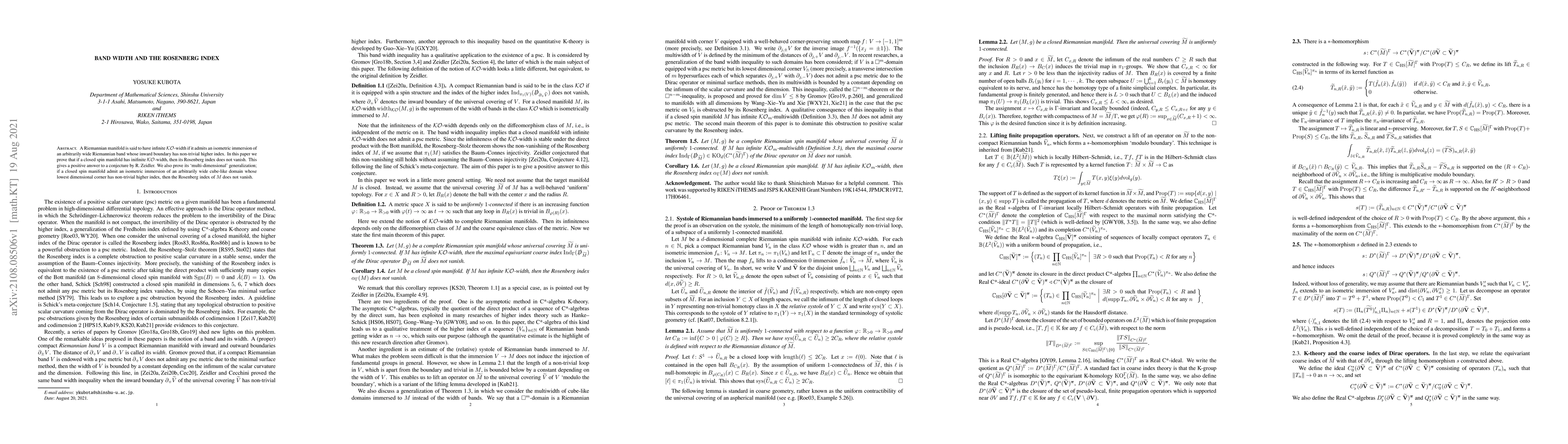 A Riemannian manifold is said to have infinite $\mathcal{KO}$-width if it admits an isometric immersion of an arbitrarily wide Riemannian band whose inward boundary has non-trivial higher index. In this paper we prove that if a closed spin manifold has inifinite $\mathcal{KO}$-width, then its Rosenberg index does not vanish. This gives a positive answer to a conjecture by R. Zeidler. We also prove its `multi-dimensional' generalization; if a closed spin manifold admit an isometric immersion of an arbitrarily wide cube-like domain whose lowest dimensional corner has non-trivial higher index, then the Rosenberg index of $M$ does not vanish.