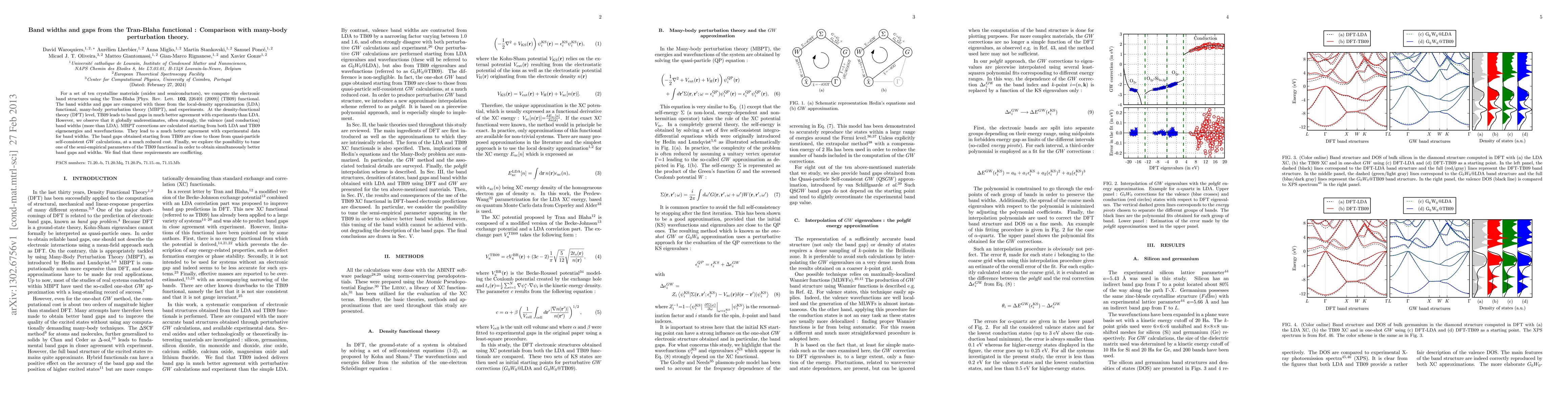 This study compares electronic band structures of ten materials computed using the Tran-Blaha (TB09) functional against LDA, MBPT, and experiments. The TB09 functional provides better band gap agreement with experiments but underestimates band widths. MBPT corrections improve band width agreement, while tuning TB09 parameters to optimize both band gaps and widths proves challenging.